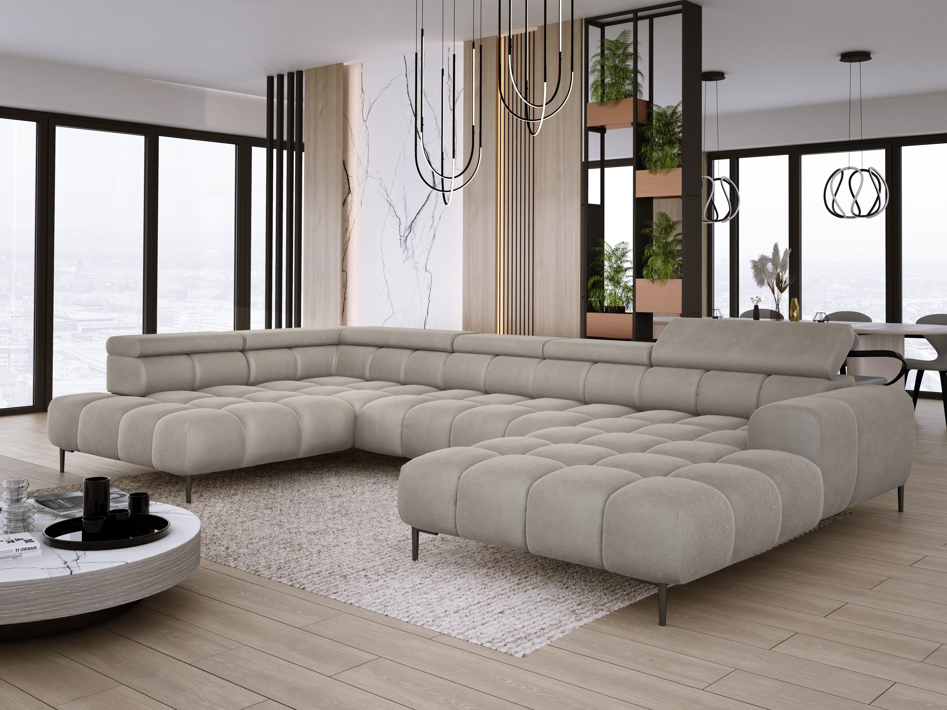 Dodatkowo narożnik wyposażony jest w przesuwne oparcie oraz 6 regulowanych zagłówków z możliwością blokady w dowolnej pozycji. Stylowe pikowane siedzisko i wysokie metalowe nóżki (dostępne w kolorze czarnym lub złotym) nadają całości elegancki, loftowy charakter.