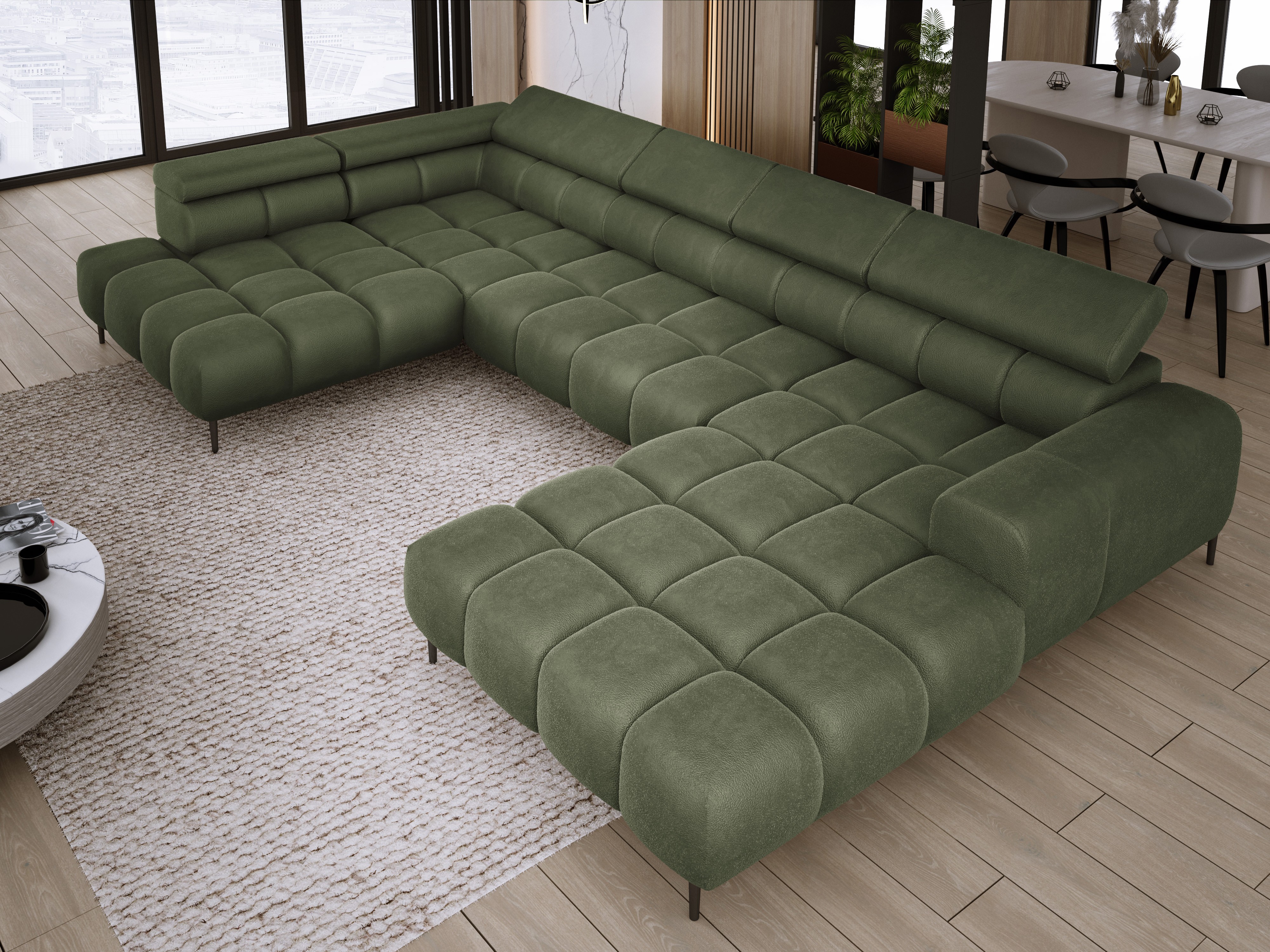 Dodatkowo narożnik wyposażony jest w przesuwne oparcie oraz 6 regulowanych zagłówków z możliwością blokady w dowolnej pozycji. Stylowe pikowane siedzisko i wysokie metalowe nóżki (dostępne w kolorze czarnym lub złotym) nadają całości elegancki, loftowy charakter.