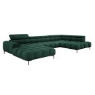 Dodatkowo narożnik wyposażony jest w przesuwne oparcie oraz 6 regulowanych zagłówków z możliwością blokady w dowolnej pozycji. Stylowe pikowane siedzisko i wysokie metalowe nóżki (dostępne w kolorze czarnym lub złotym) nadają całości elegancki, loftowy charakter.