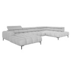 Dodatkowo narożnik wyposażony jest w przesuwne oparcie oraz 6 regulowanych zagłówków z możliwością blokady w dowolnej pozycji. Stylowe pikowane siedzisko i wysokie metalowe nóżki (dostępne w kolorze czarnym lub złotym) nadają całości elegancki, loftowy charakter.