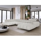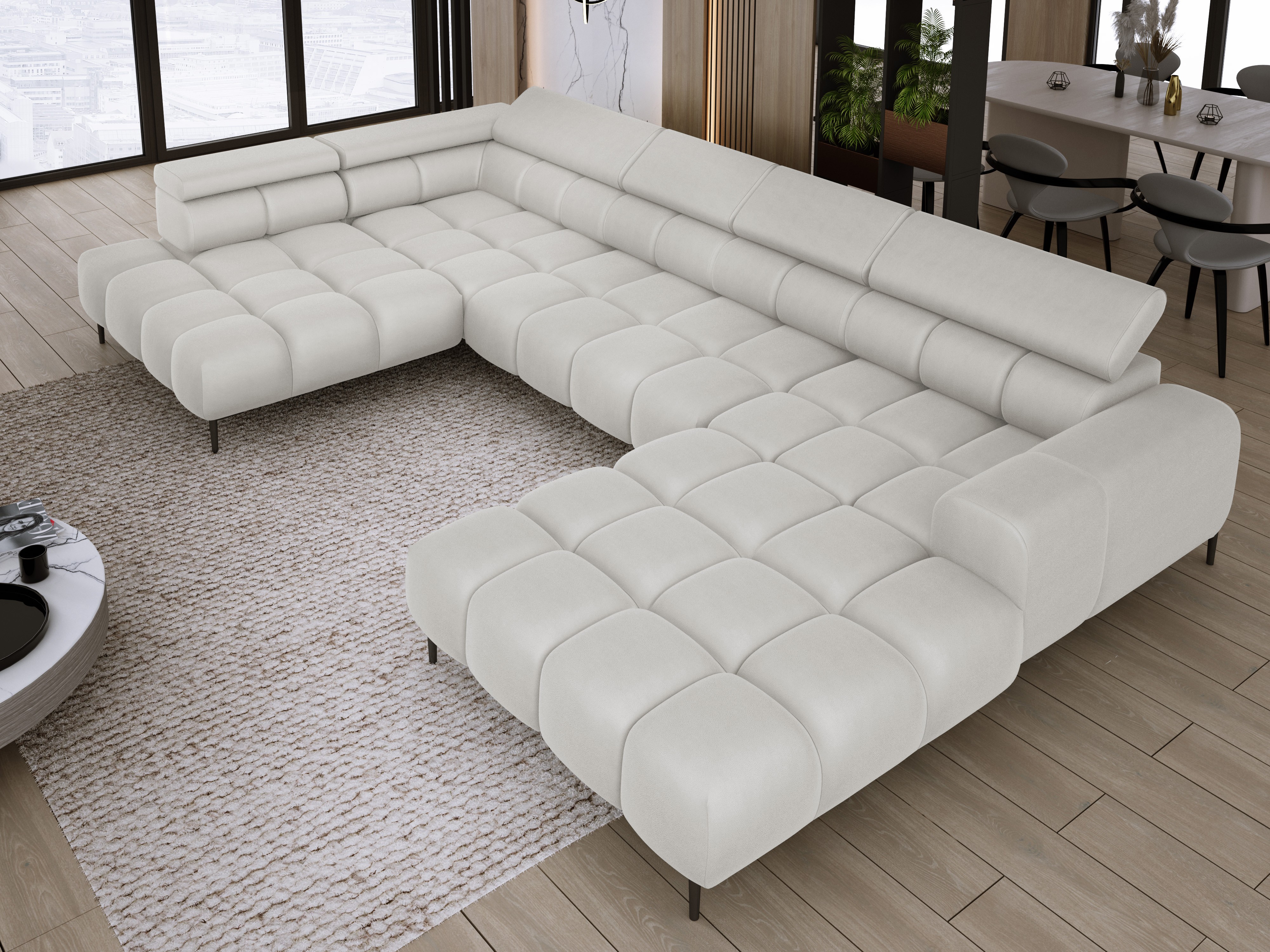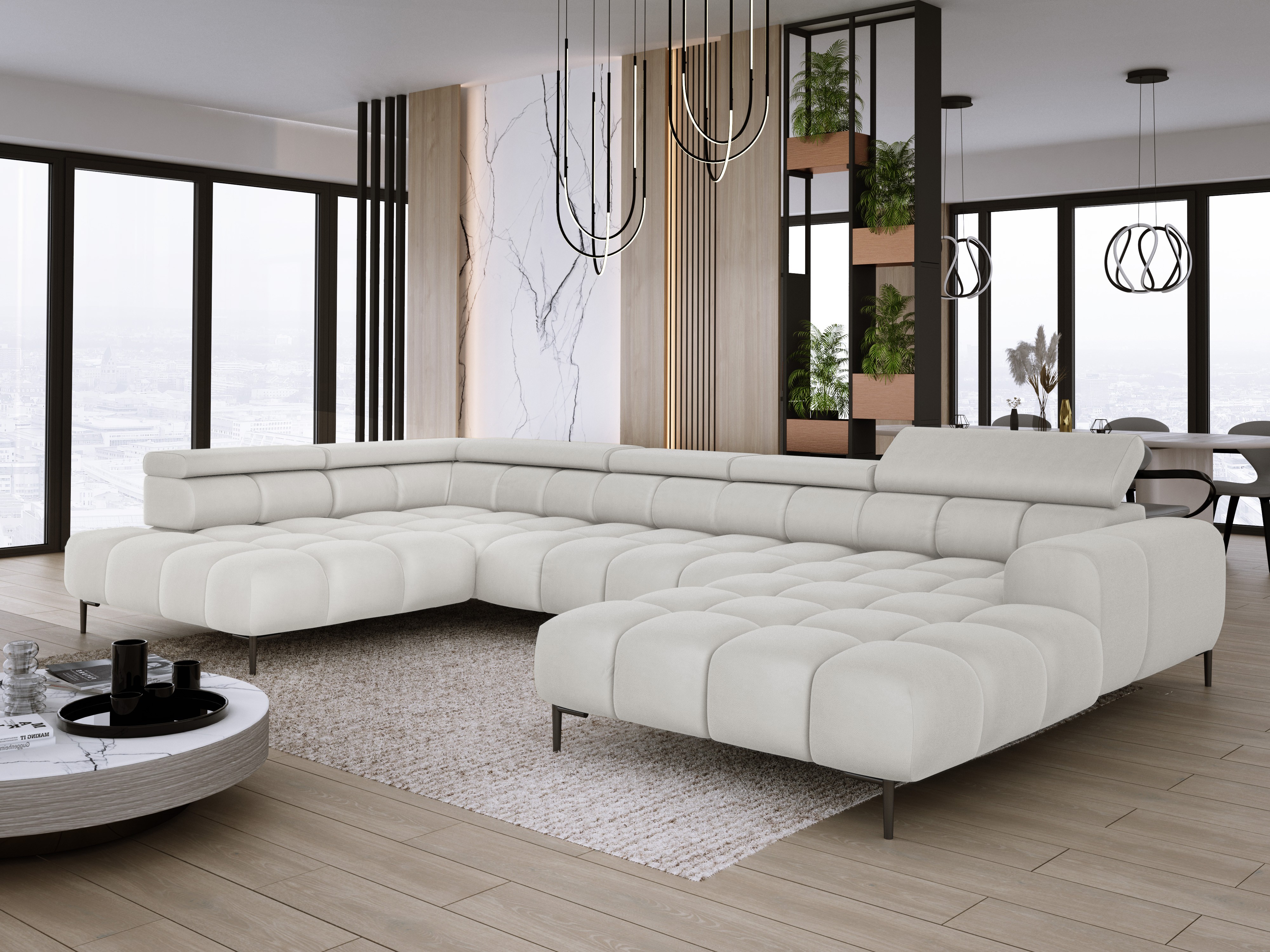 Dodatkowo narożnik wyposażony jest w przesuwne oparcie oraz 6 regulowanych zagłówków z możliwością blokady w dowolnej pozycji. Stylowe pikowane siedzisko i wysokie metalowe nóżki (dostępne w kolorze czarnym lub złotym) nadają całości elegancki, loftowy charakter.
