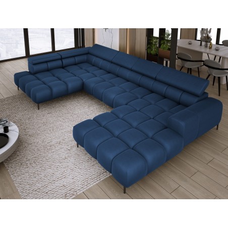 Dodatkowo narożnik wyposażony jest w przesuwne oparcie oraz 6 regulowanych zagłówków z możliwością blokady w dowolnej pozycji. Stylowe pikowane siedzisko i wysokie metalowe nóżki (dostępne w kolorze czarnym lub złotym) nadają całości elegancki, loftowy charakter.