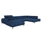 Dodatkowo narożnik wyposażony jest w przesuwne oparcie oraz 6 regulowanych zagłówków z możliwością blokady w dowolnej pozycji. Stylowe pikowane siedzisko i wysokie metalowe nóżki (dostępne w kolorze czarnym lub złotym) nadają całości elegancki, loftowy charakter.