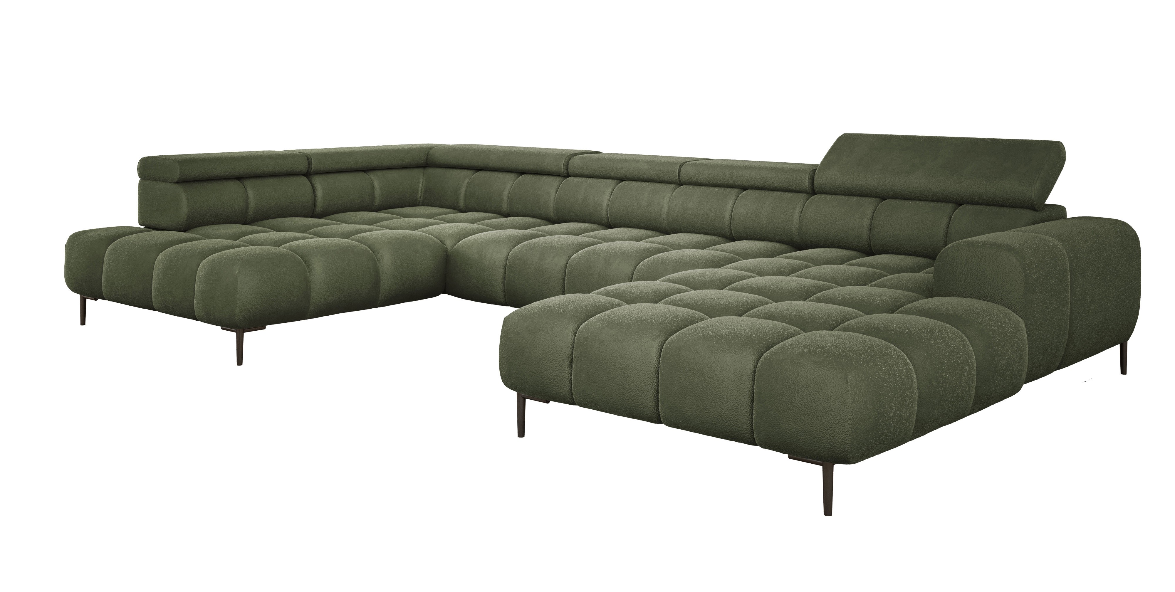 Dodatkowo narożnik wyposażony jest w przesuwne oparcie oraz 6 regulowanych zagłówków z możliwością blokady w dowolnej pozycji. Stylowe pikowane siedzisko i wysokie metalowe nóżki (dostępne w kolorze czarnym lub złotym) nadają całości elegancki, loftowy charakter.