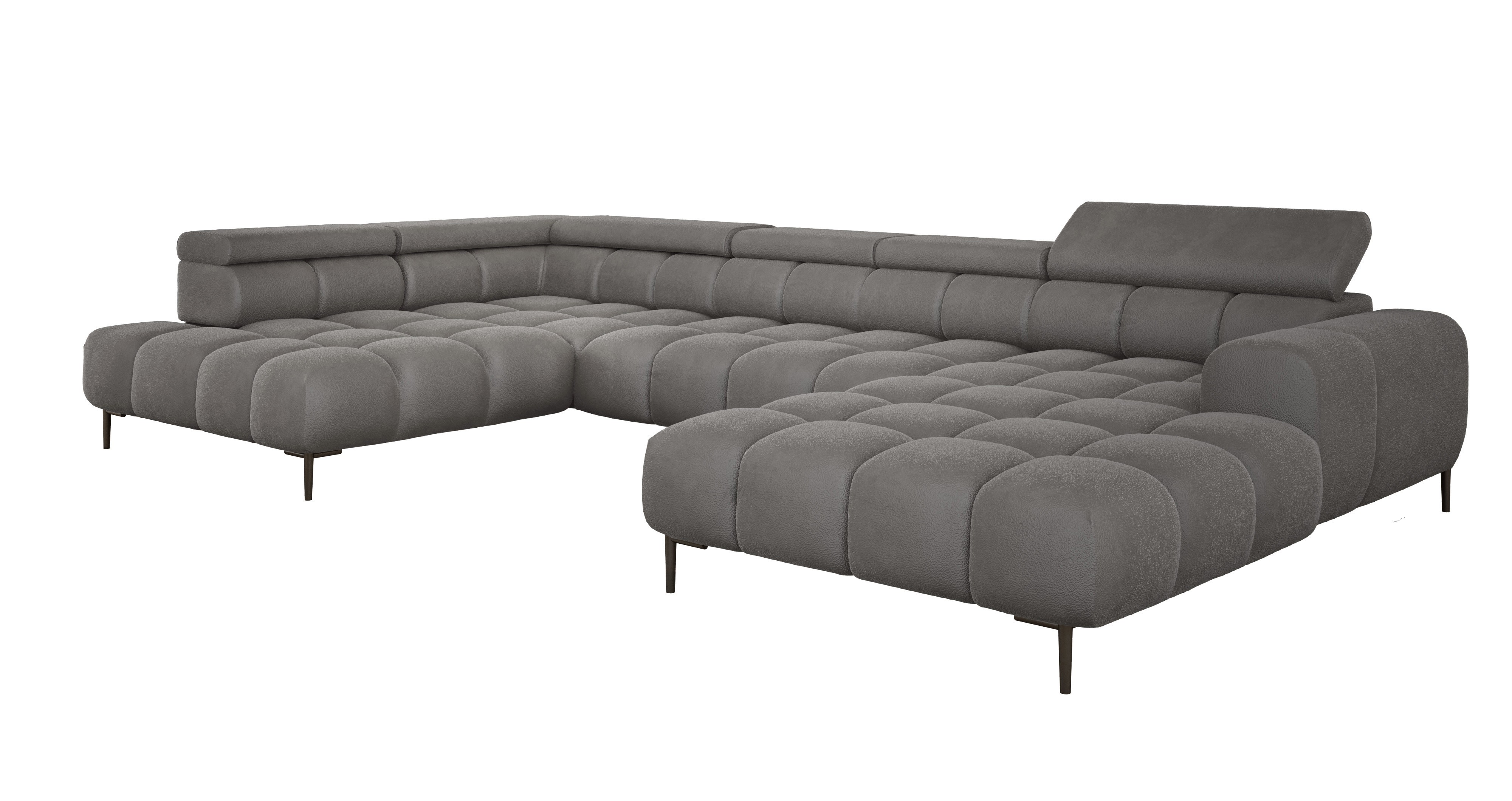 Dodatkowo narożnik wyposażony jest w przesuwne oparcie oraz 6 regulowanych zagłówków z możliwością blokady w dowolnej pozycji. Stylowe pikowane siedzisko i wysokie metalowe nóżki (dostępne w kolorze czarnym lub złotym) nadają całości elegancki, loftowy charakter.