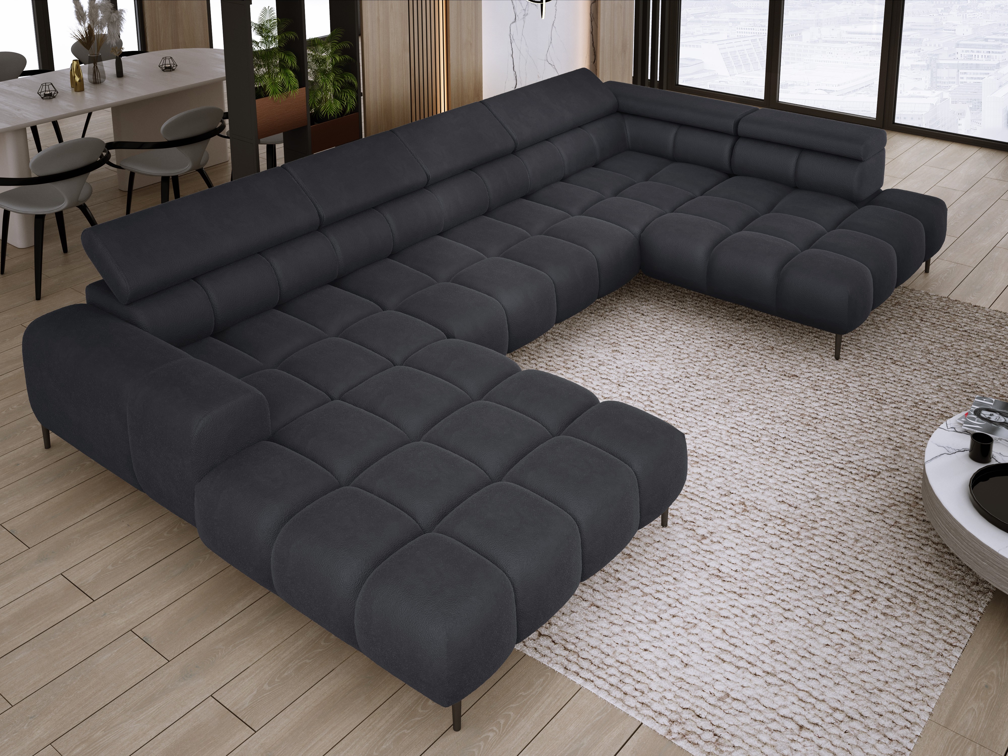 Dodatkowo narożnik wyposażony jest w przesuwne oparcie oraz 6 regulowanych zagłówków z możliwością blokady w dowolnej pozycji. Stylowe pikowane siedzisko i wysokie metalowe nóżki (dostępne w kolorze czarnym lub złotym) nadają całości elegancki, loftowy charakter.