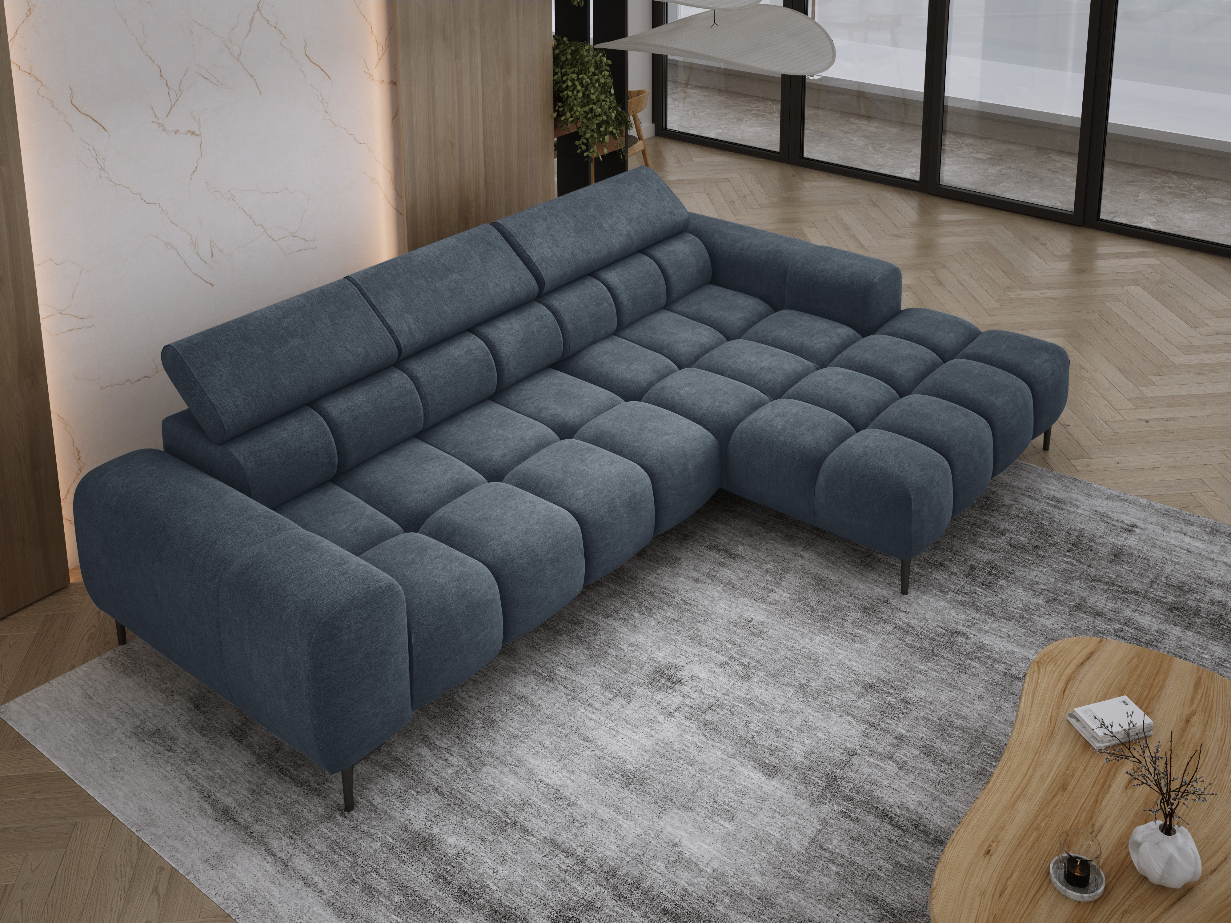 Pikowane siedzisko nadaje narożnikowi nowoczesnego charakteru, a wysokie metalowe nóżki (czarne lub złote) w stylu loftowym dodają mu lekkości i elegancji.