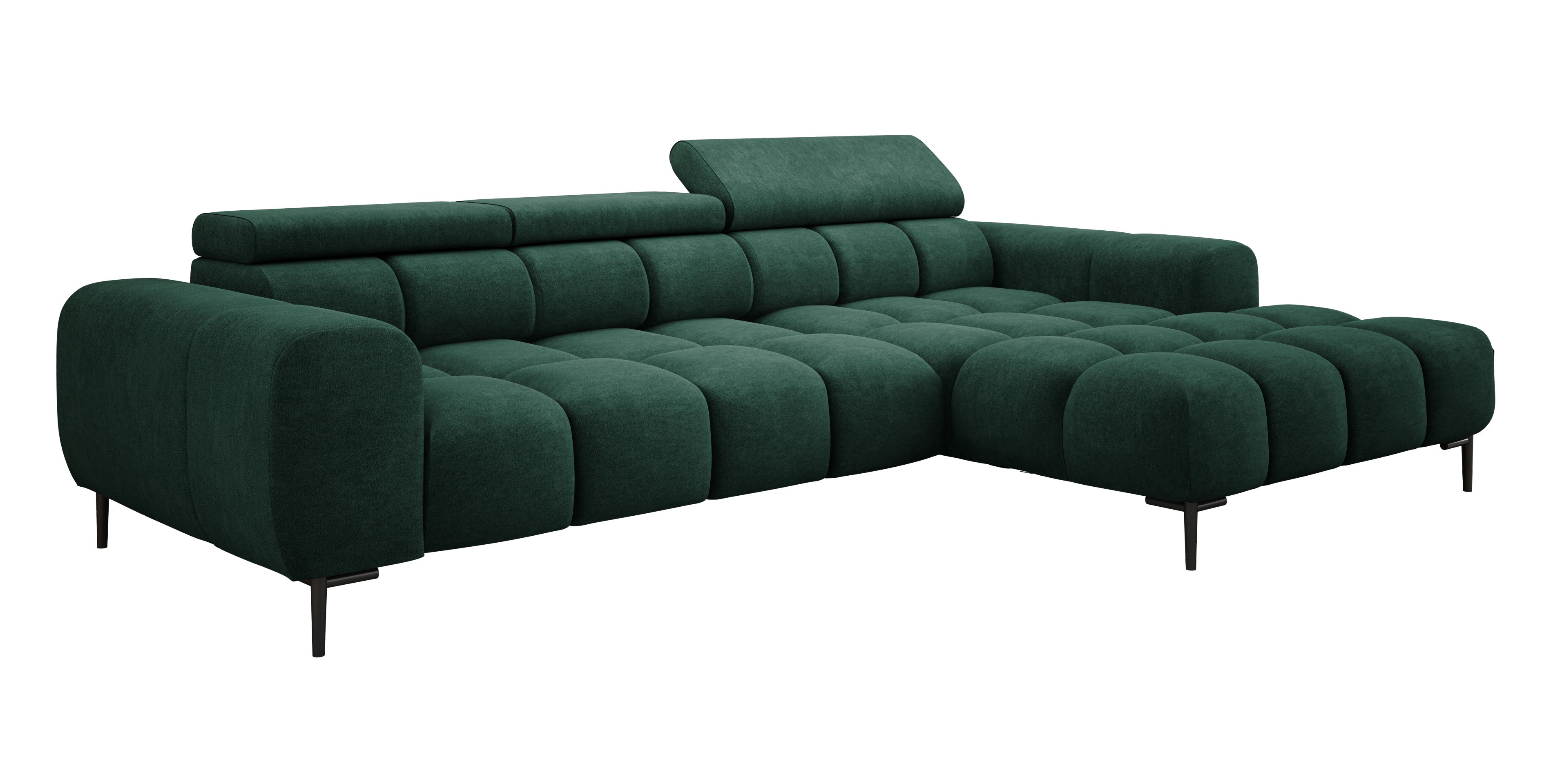 Pikowane siedzisko nadaje narożnikowi nowoczesnego charakteru, a wysokie metalowe nóżki (czarne lub złote) w stylu loftowym dodają mu lekkości i elegancji.