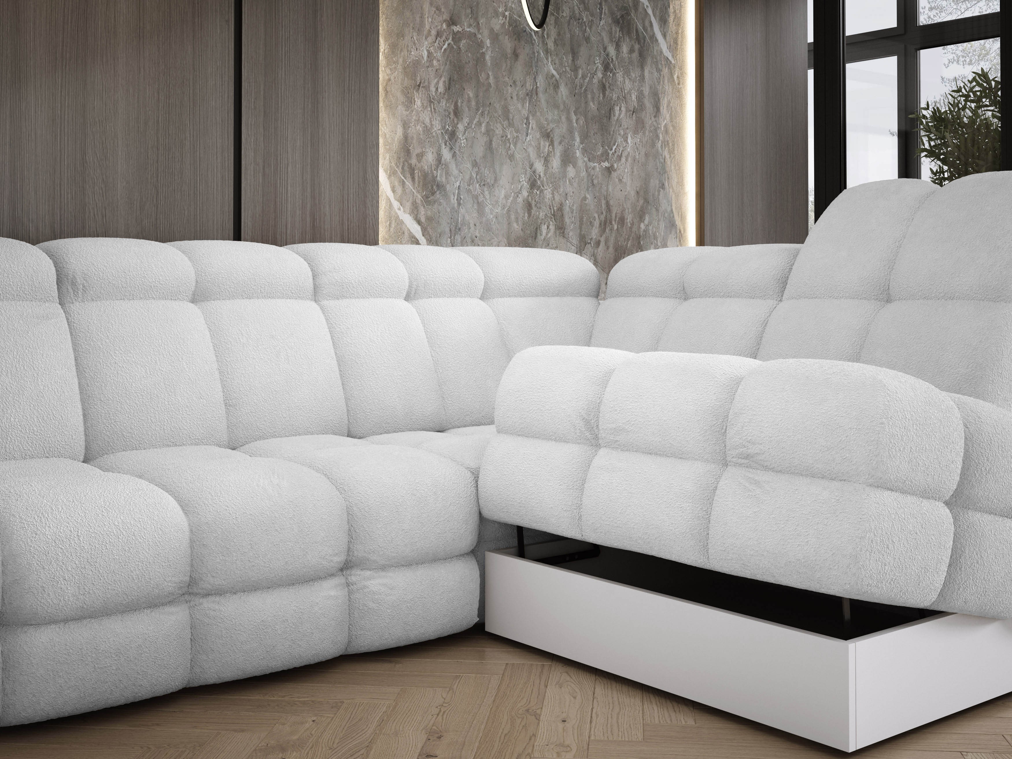 Wyposażony w elektryczną funkcję spania, Tollo L zapewnia komfort użytkowania na co dzień i pełną wygodę podczas odpoczynku. Mechanizm wysuwania działa płynnie i cicho, a możliwość regulacji głębokości siedziska pozwala dostosować mebel do własnych potrzeb – od relaksu po pełnowymiarową funkcję snu. Zintegrowany pojemnik na pościel ułatwia organizację i utrzymanie porządku bez konieczności rezygnowania z estetyki.