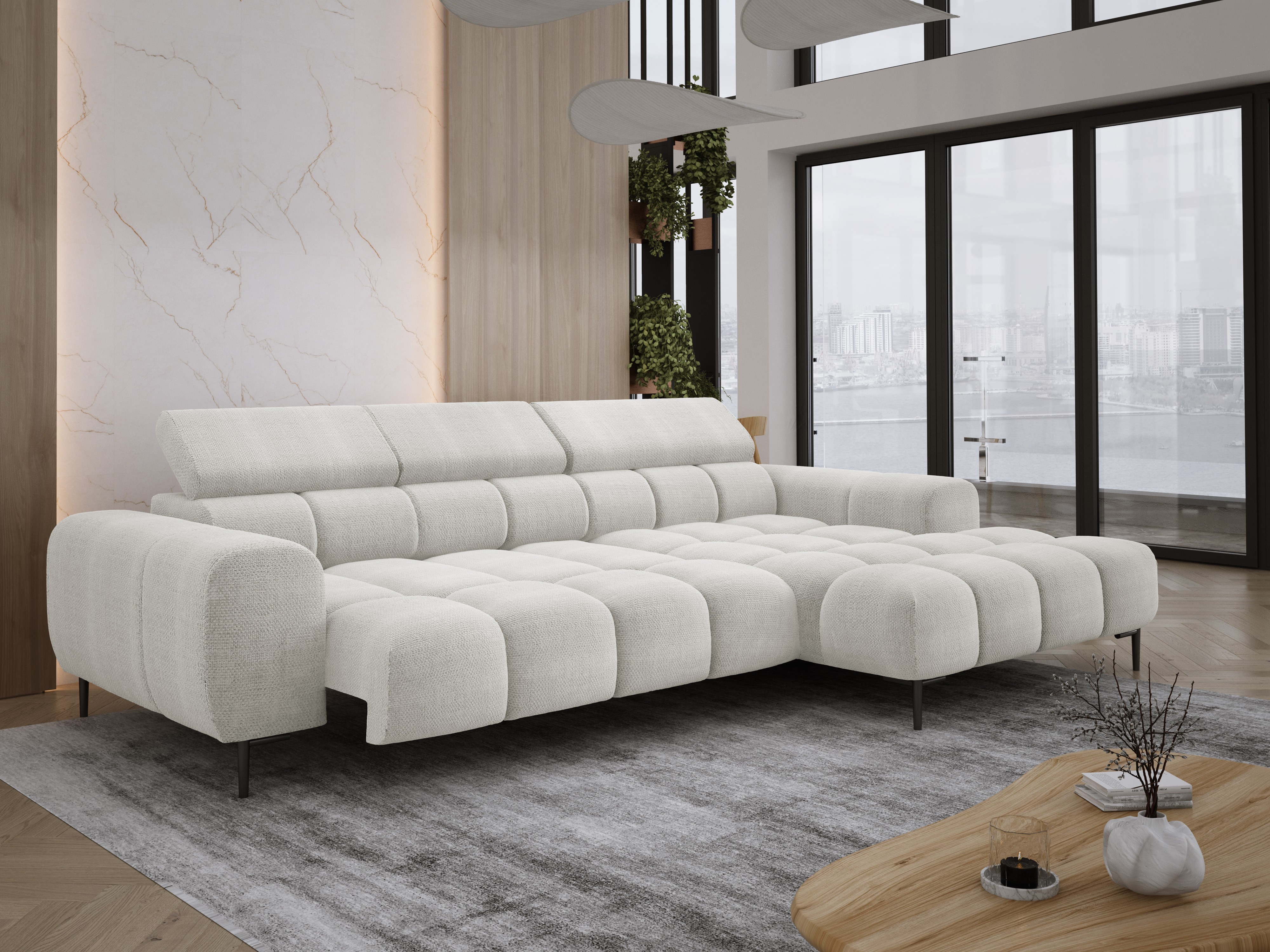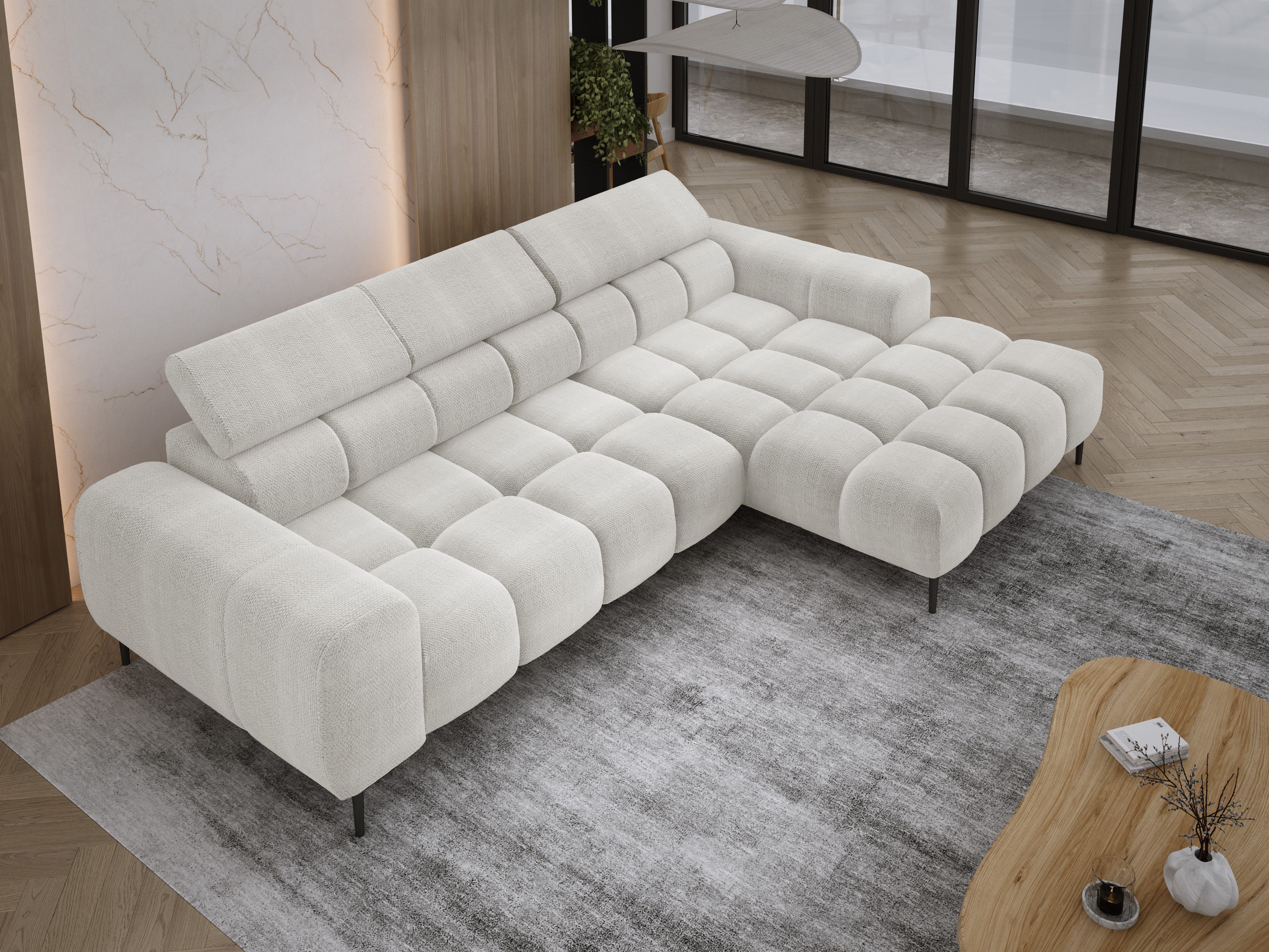 Pikowane siedzisko nadaje narożnikowi nowoczesnego charakteru, a wysokie metalowe nóżki (czarne lub złote) w stylu loftowym dodają mu lekkości i elegancji.
