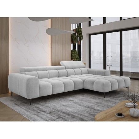Pikowane siedzisko nadaje narożnikowi nowoczesnego charakteru, a wysokie metalowe nóżki (czarne lub złote) w stylu loftowym dodają mu lekkości i elegancji.