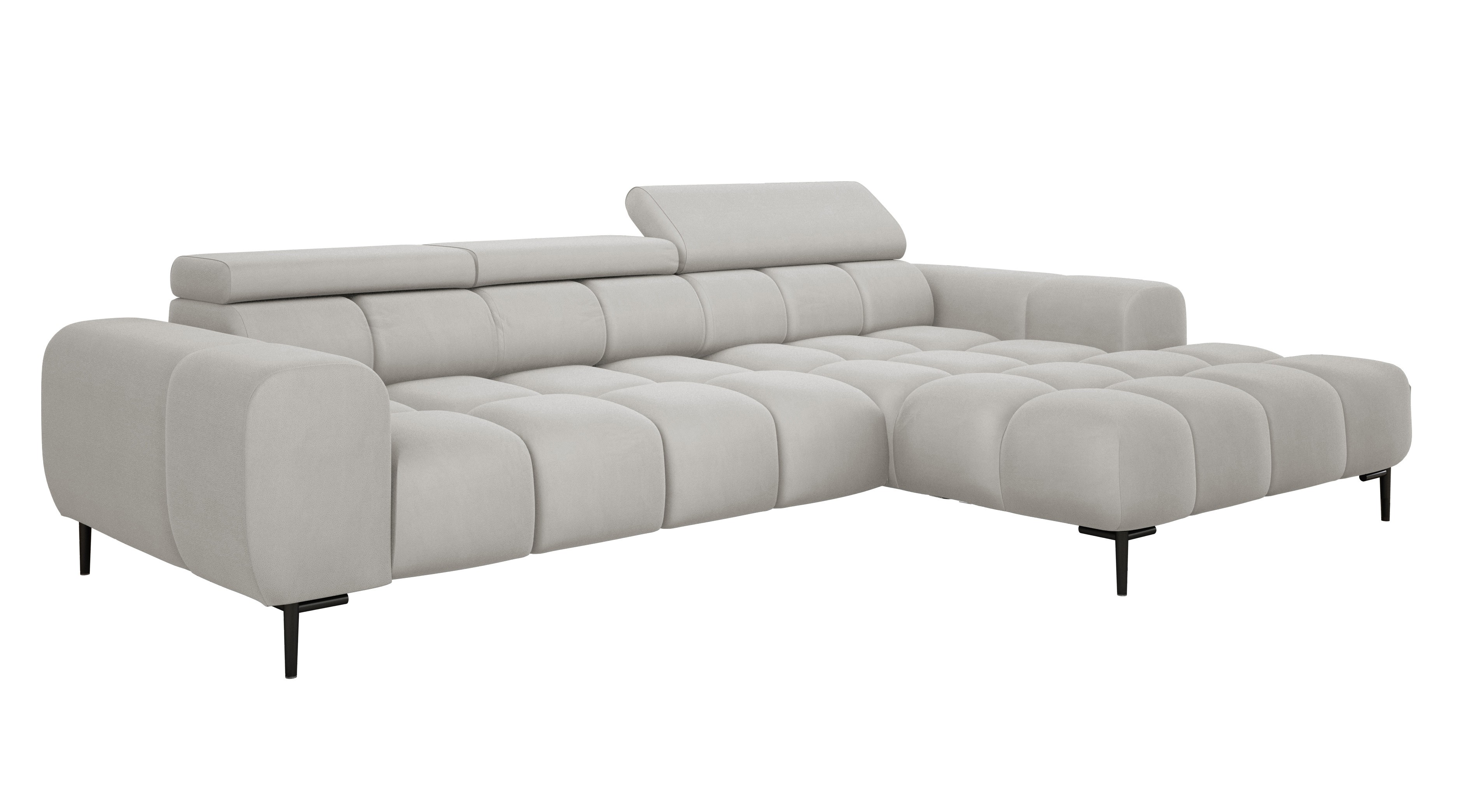 Pikowane siedzisko nadaje narożnikowi nowoczesnego charakteru, a wysokie metalowe nóżki (czarne lub złote) w stylu loftowym dodają mu lekkości i elegancji.