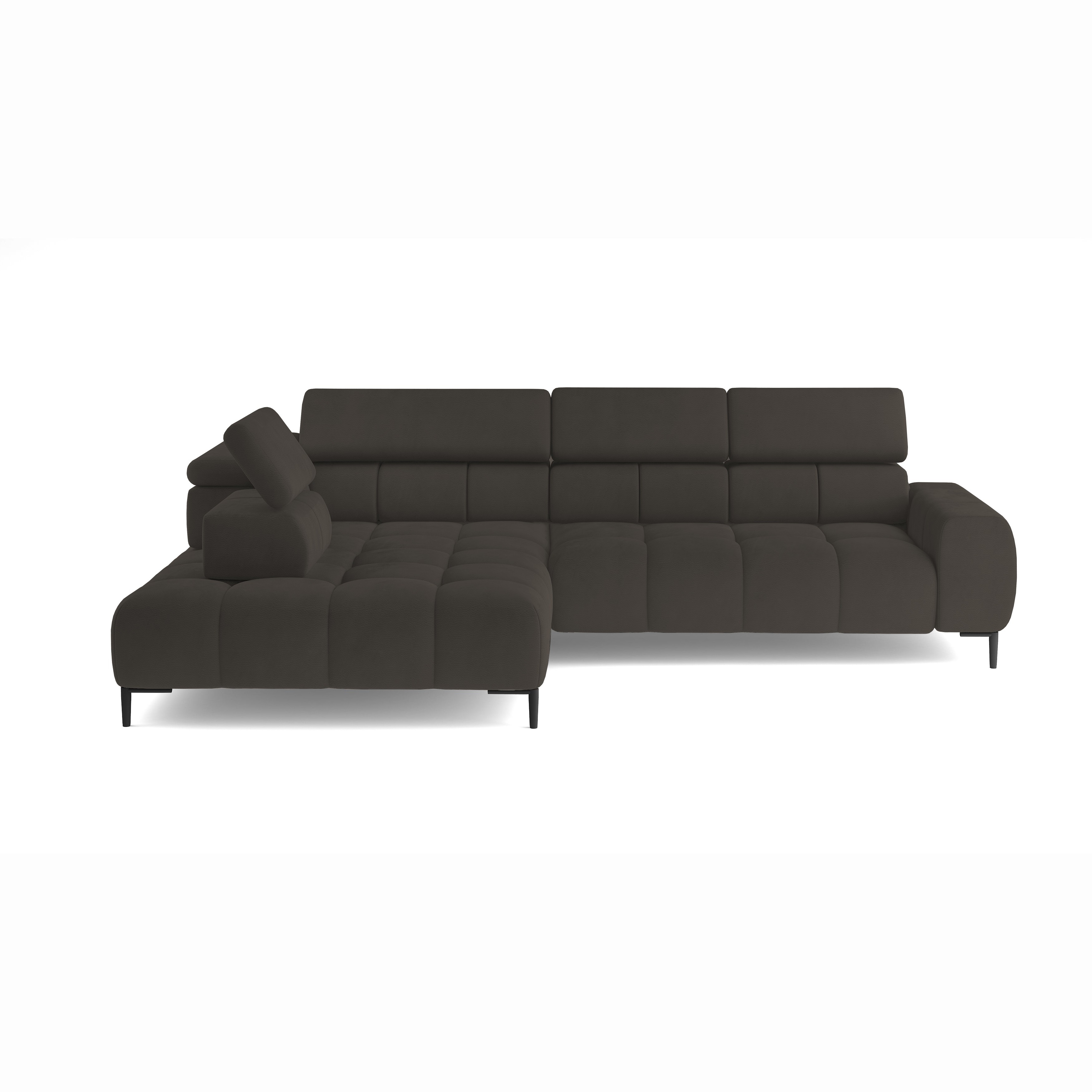 Stylowe pikowane siedzisko i wysokie metalowe nóżki (dostępne w kolorze czarnym lub złotym) nadają narożnikowi lekko loftowy, a jednocześnie nowoczesny charakter.