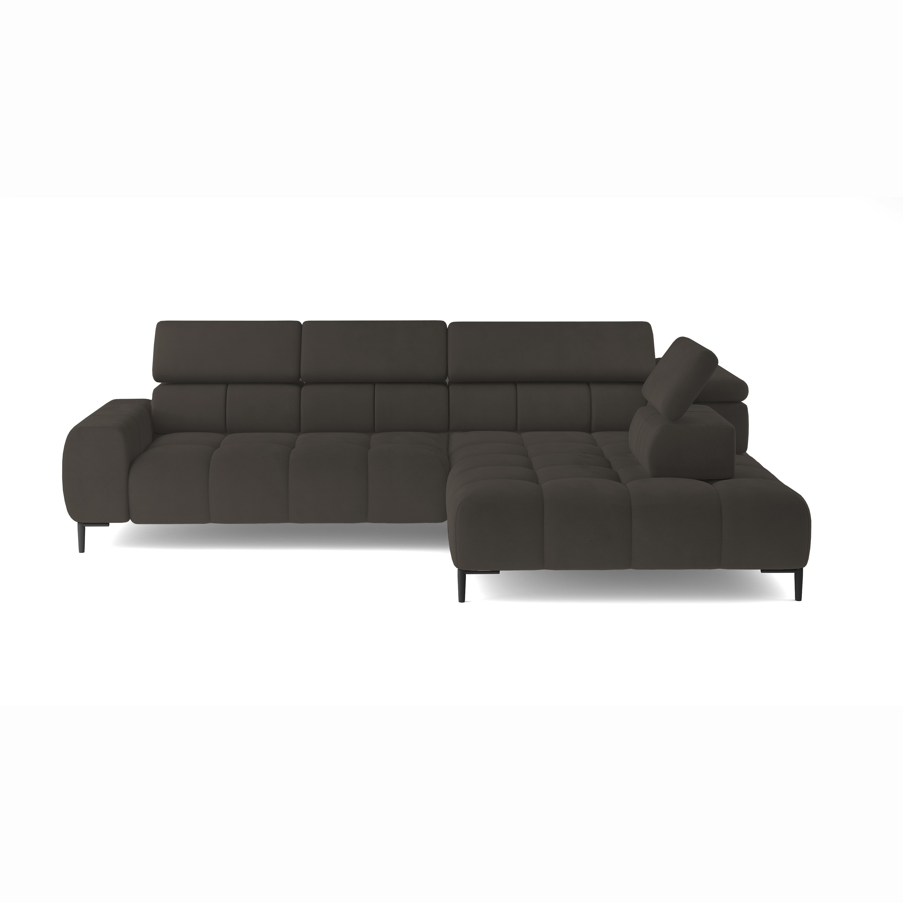 Stylowe pikowane siedzisko i wysokie metalowe nóżki (dostępne w kolorze czarnym lub złotym) nadają narożnikowi lekko loftowy, a jednocześnie nowoczesny charakter.