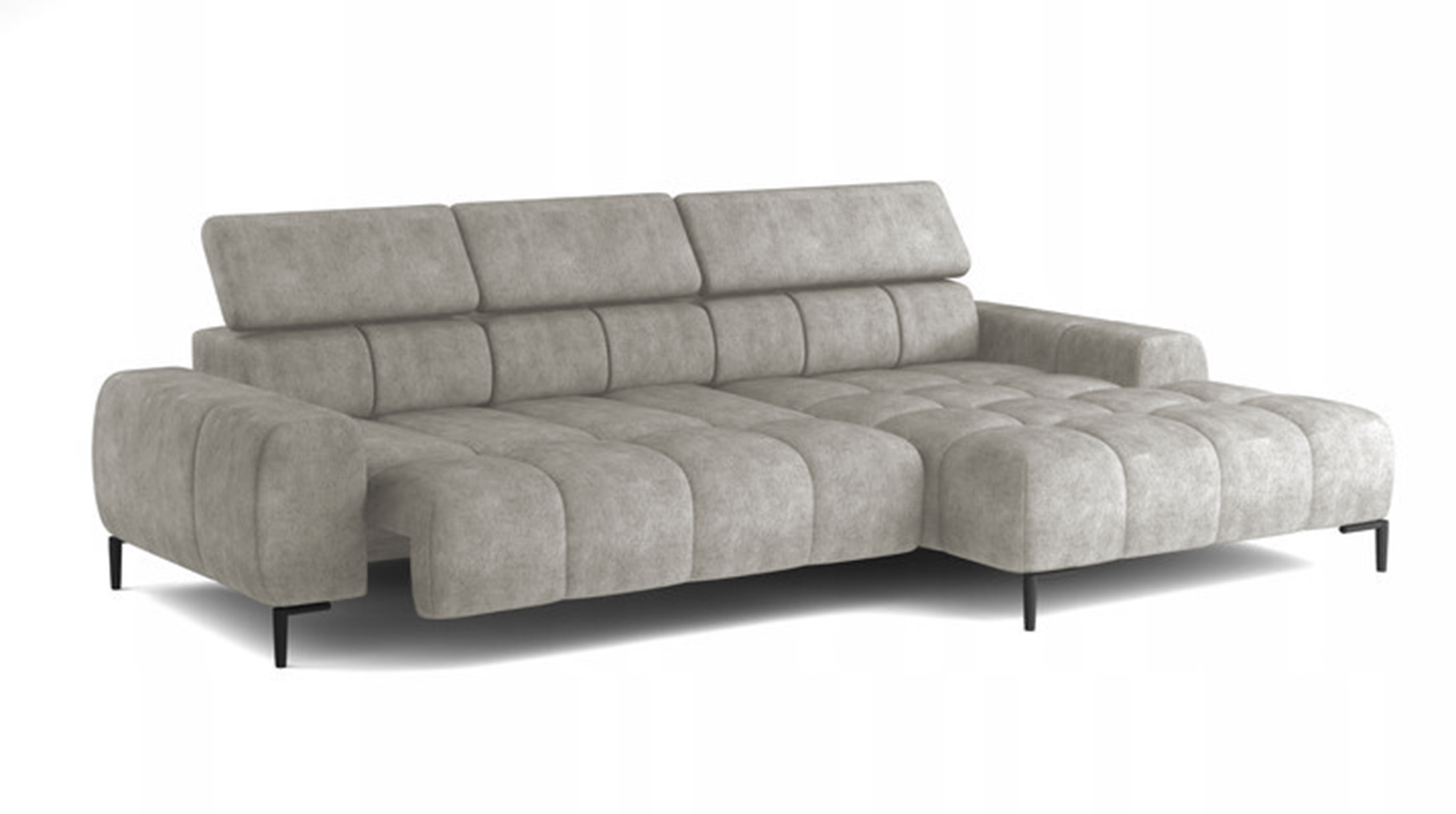 Pikowane siedzisko nadaje narożnikowi nowoczesnego charakteru, a wysokie metalowe nóżki (czarne lub złote) w stylu loftowym dodają mu lekkości i elegancji.