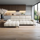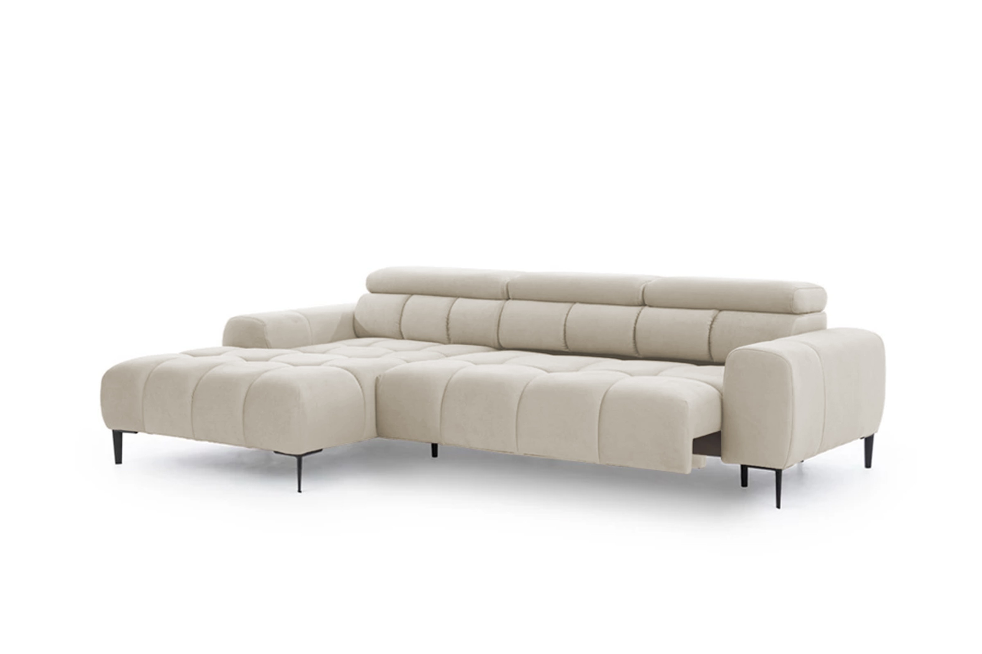 Pikowane siedzisko nadaje narożnikowi nowoczesnego charakteru, a wysokie metalowe nóżki (czarne lub złote) w stylu loftowym dodają mu lekkości i elegancji.
