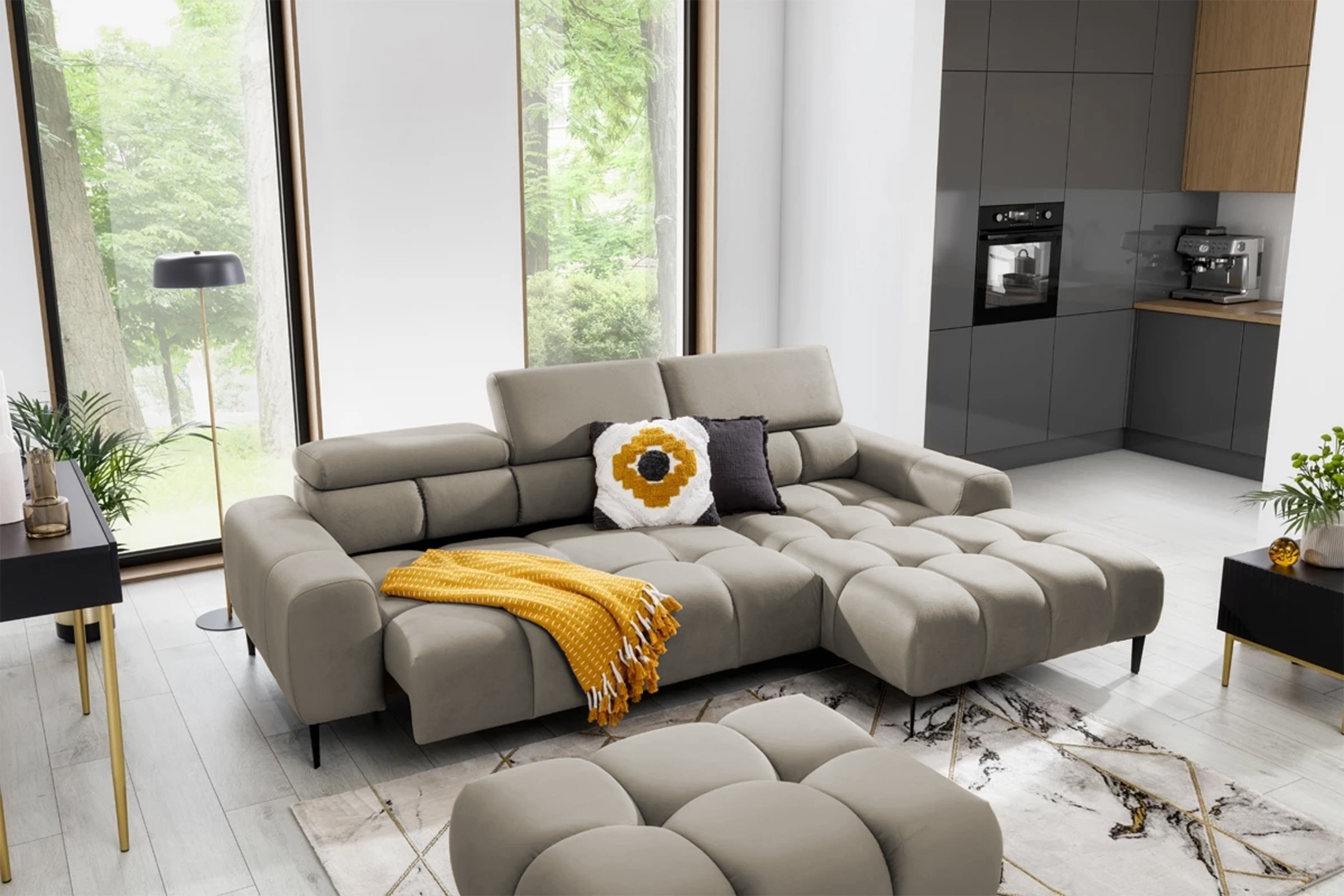 Pikowane siedzisko nadaje narożnikowi nowoczesnego charakteru, a wysokie metalowe nóżki (czarne lub złote) w stylu loftowym dodają mu lekkości i elegancji.