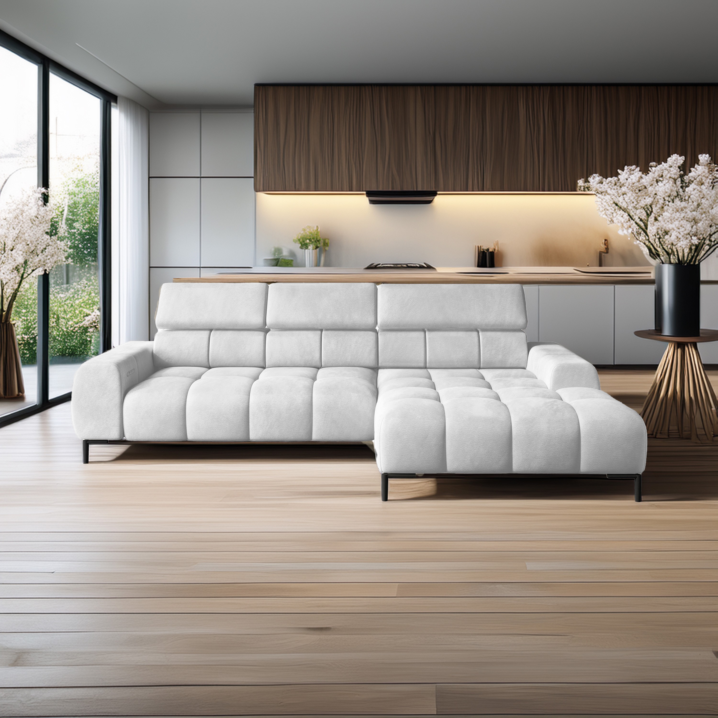 Pikowane siedzisko nadaje narożnikowi nowoczesnego charakteru, a wysokie metalowe nóżki (czarne lub złote) w stylu loftowym dodają mu lekkości i elegancji.