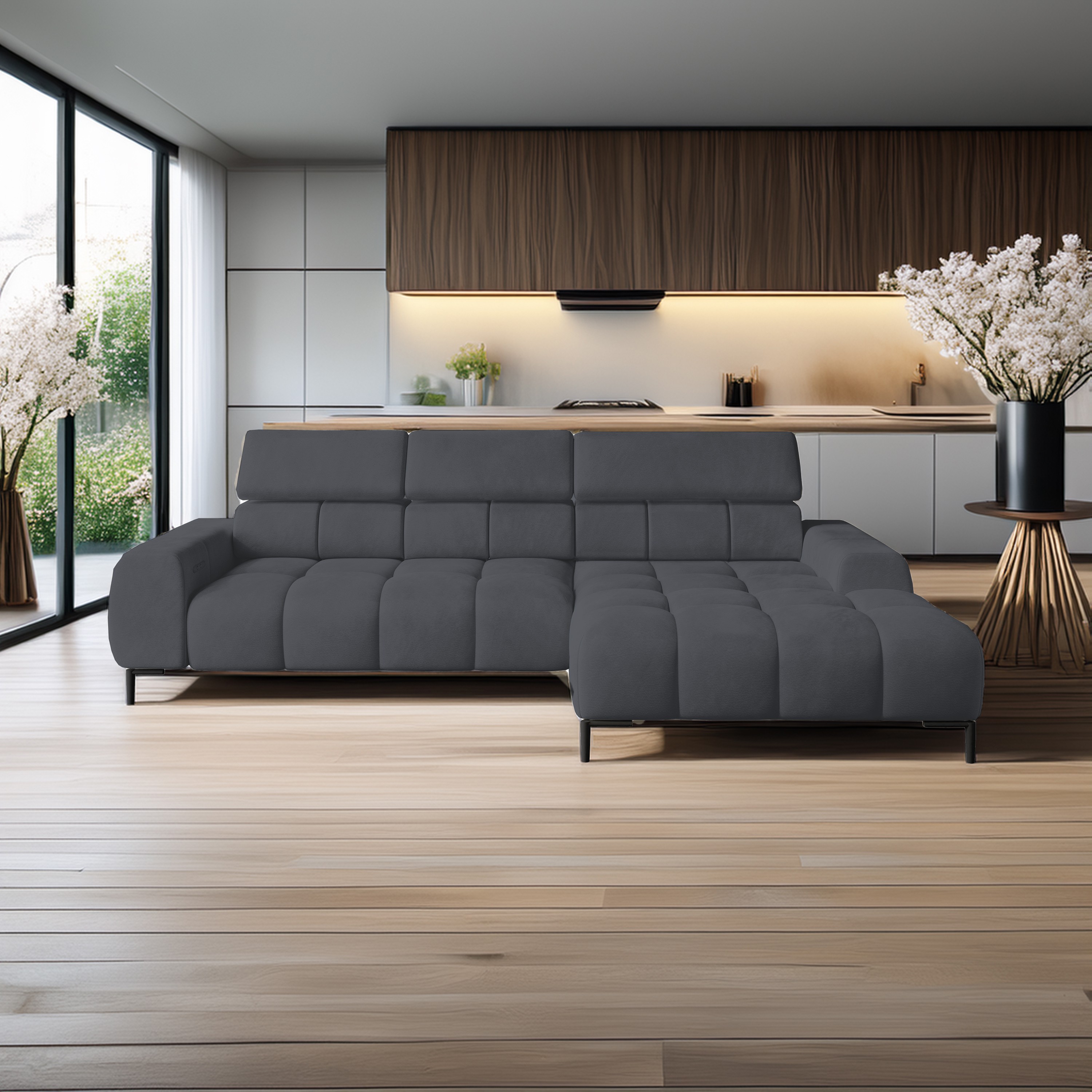 Pikowane siedzisko nadaje narożnikowi nowoczesnego charakteru, a wysokie metalowe nóżki (czarne lub złote) w stylu loftowym dodają mu lekkości i elegancji.