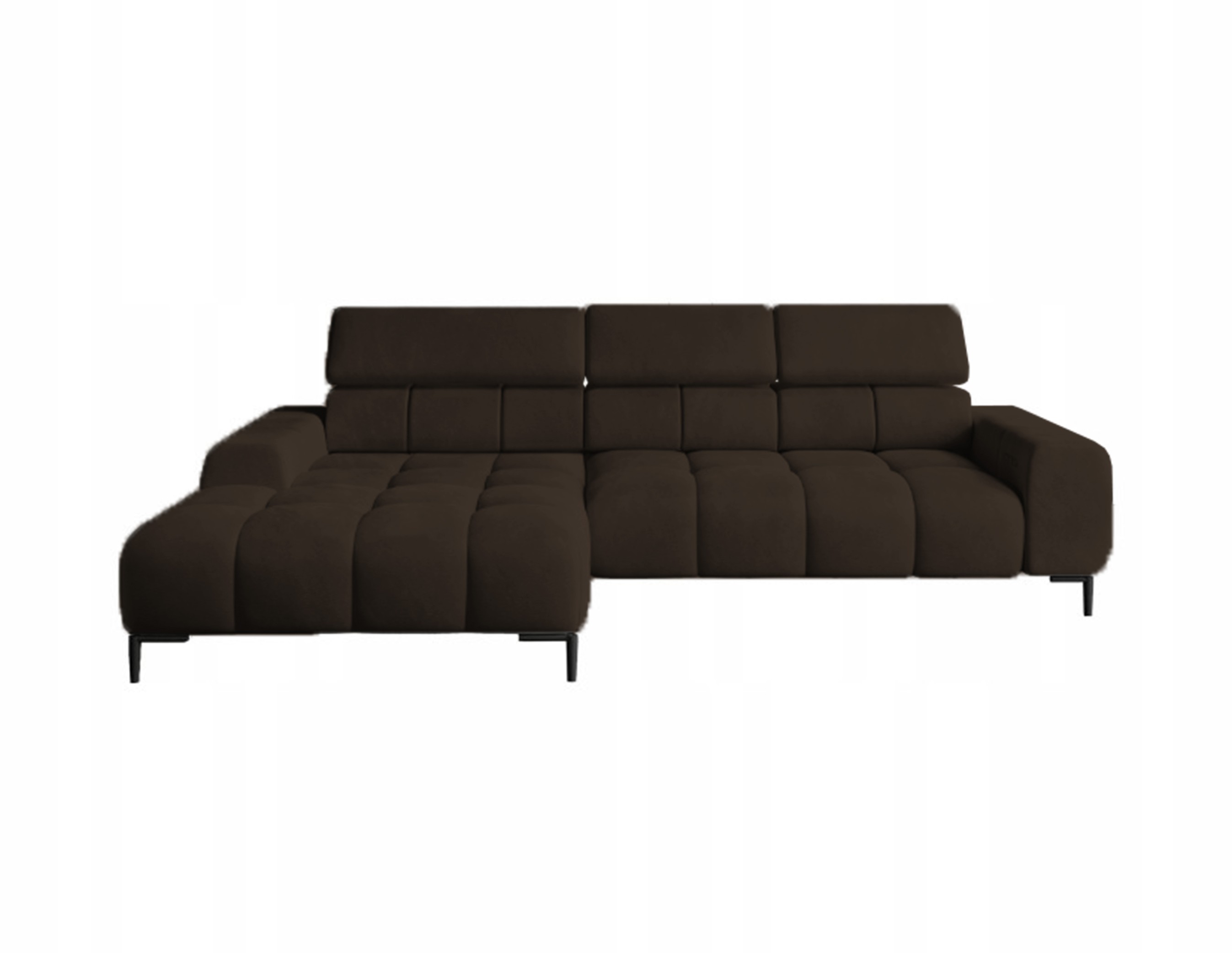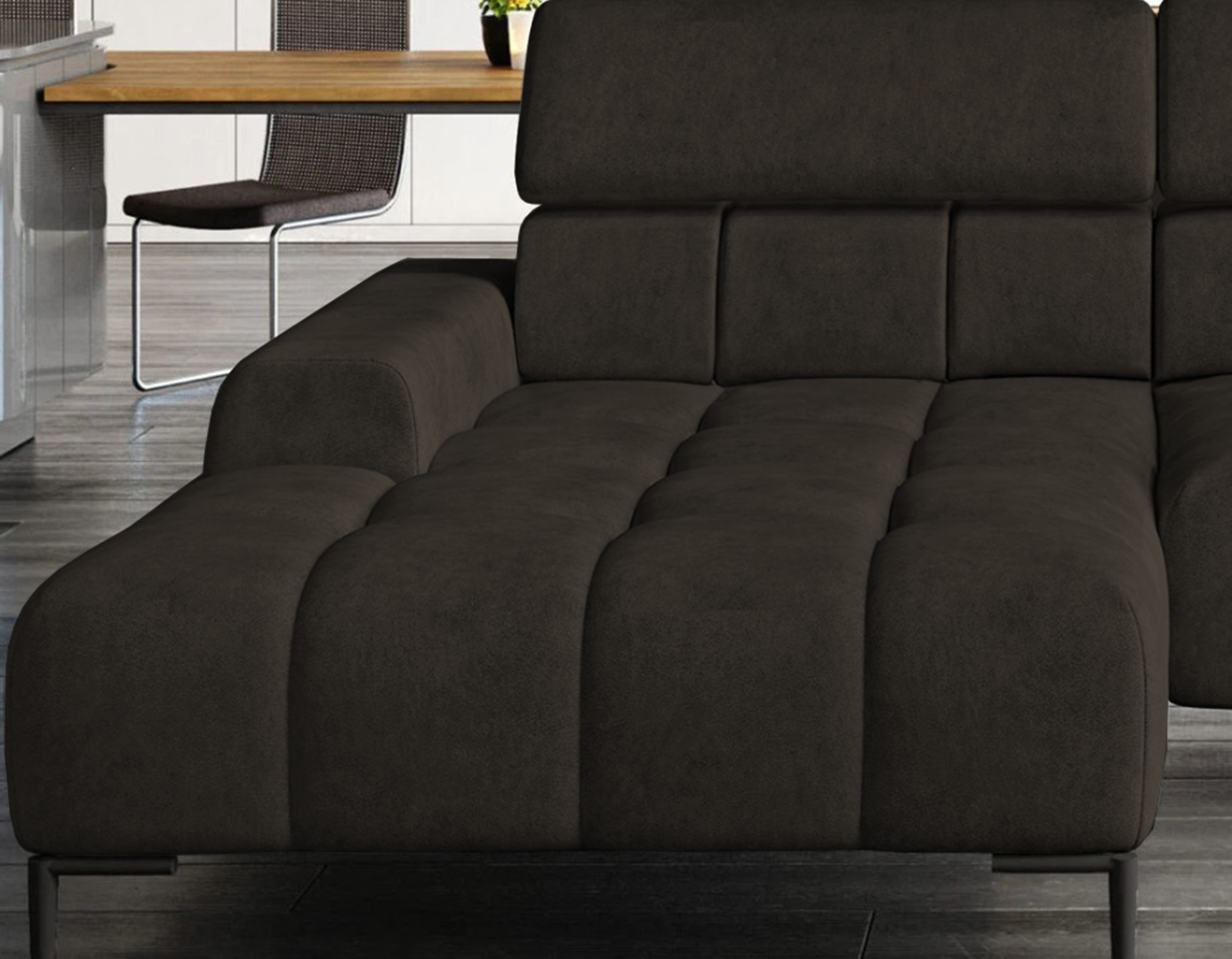 Pikowane siedzisko nadaje narożnikowi nowoczesnego charakteru, a wysokie metalowe nóżki (czarne lub złote) w stylu loftowym dodają mu lekkości i elegancji.