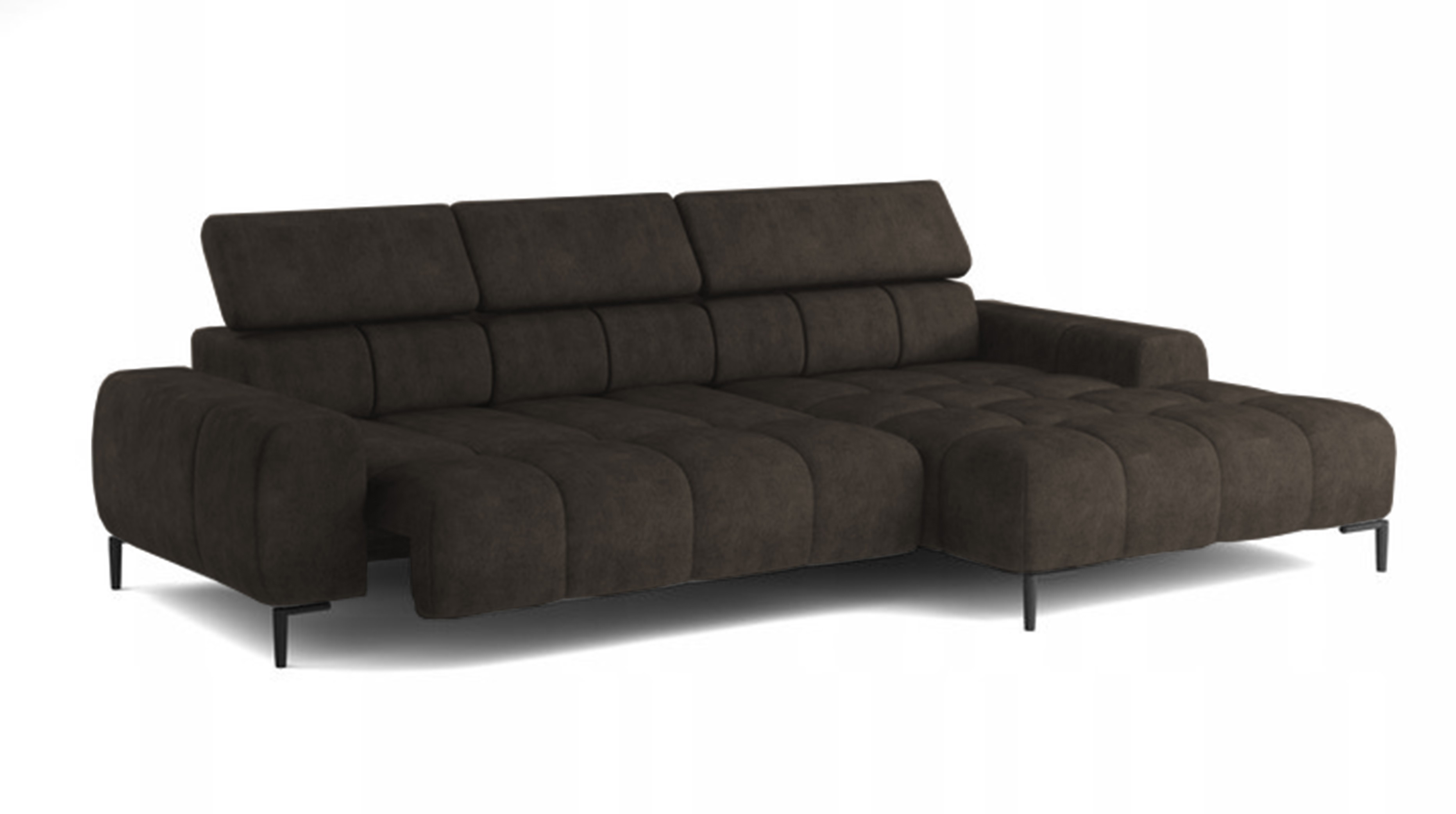 Pikowane siedzisko nadaje narożnikowi nowoczesnego charakteru, a wysokie metalowe nóżki (czarne lub złote) w stylu loftowym dodają mu lekkości i elegancji.
