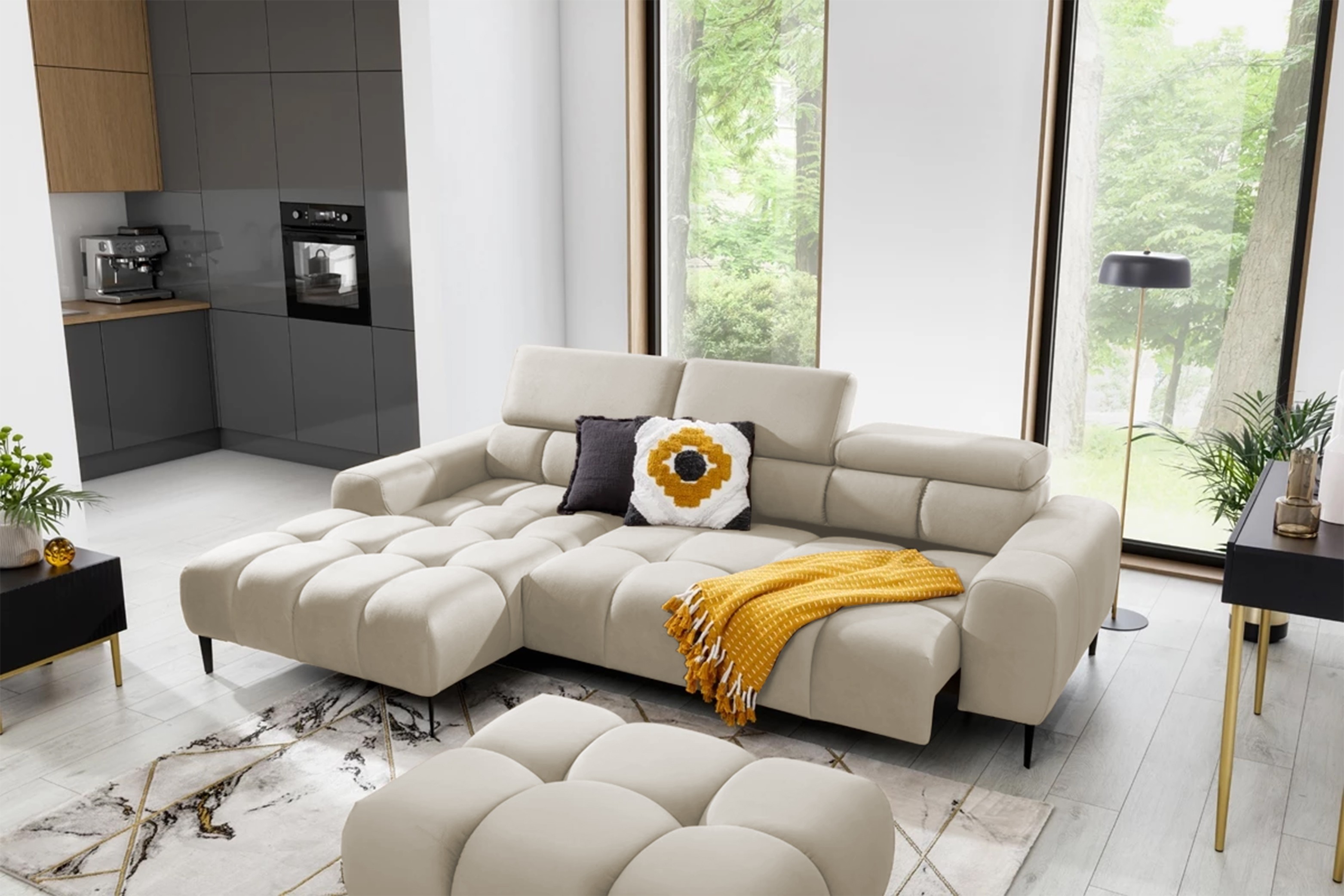 Pikowane siedzisko nadaje narożnikowi nowoczesnego charakteru, a wysokie metalowe nóżki (czarne lub złote) w stylu loftowym dodają mu lekkości i elegancji.