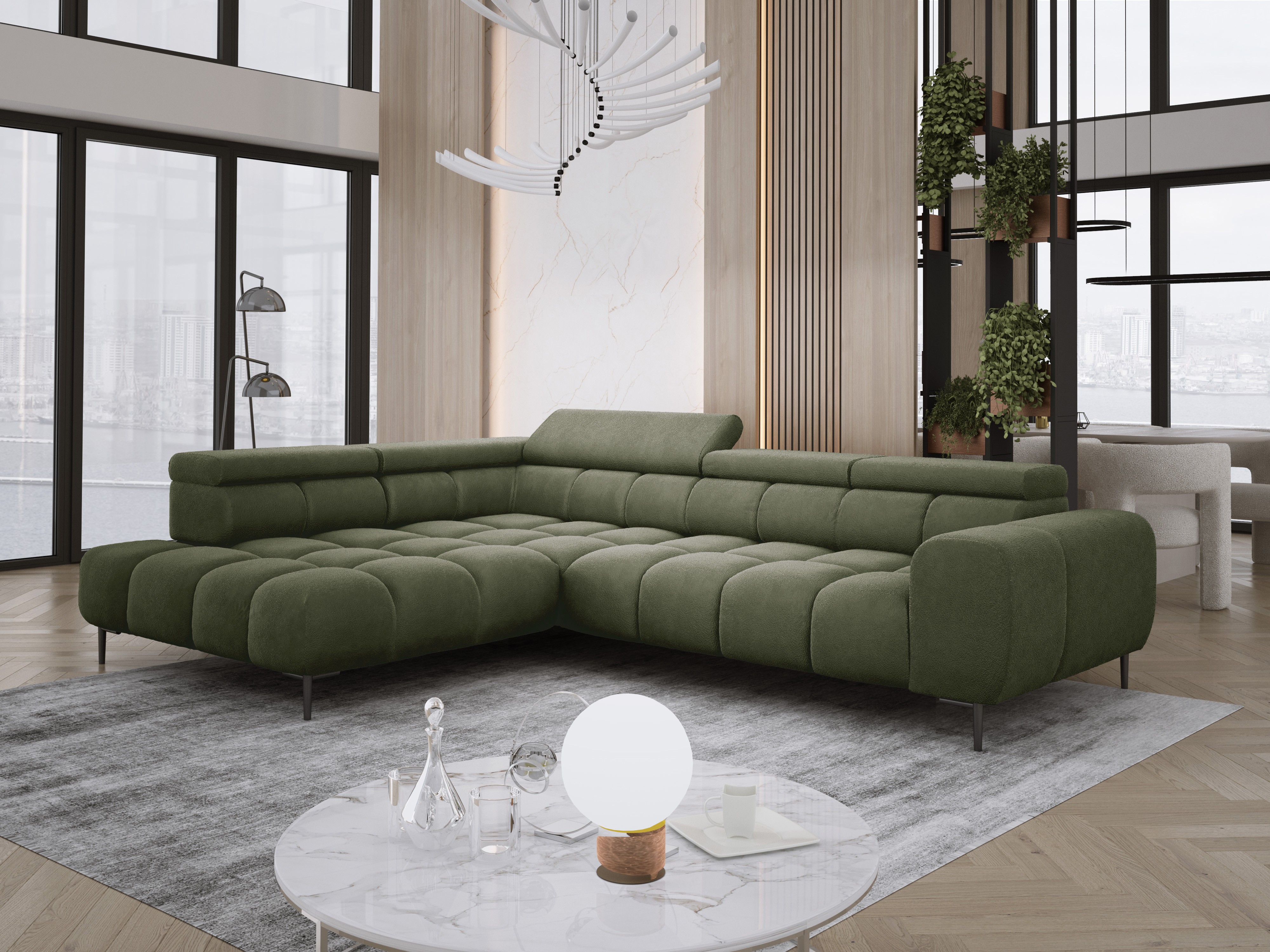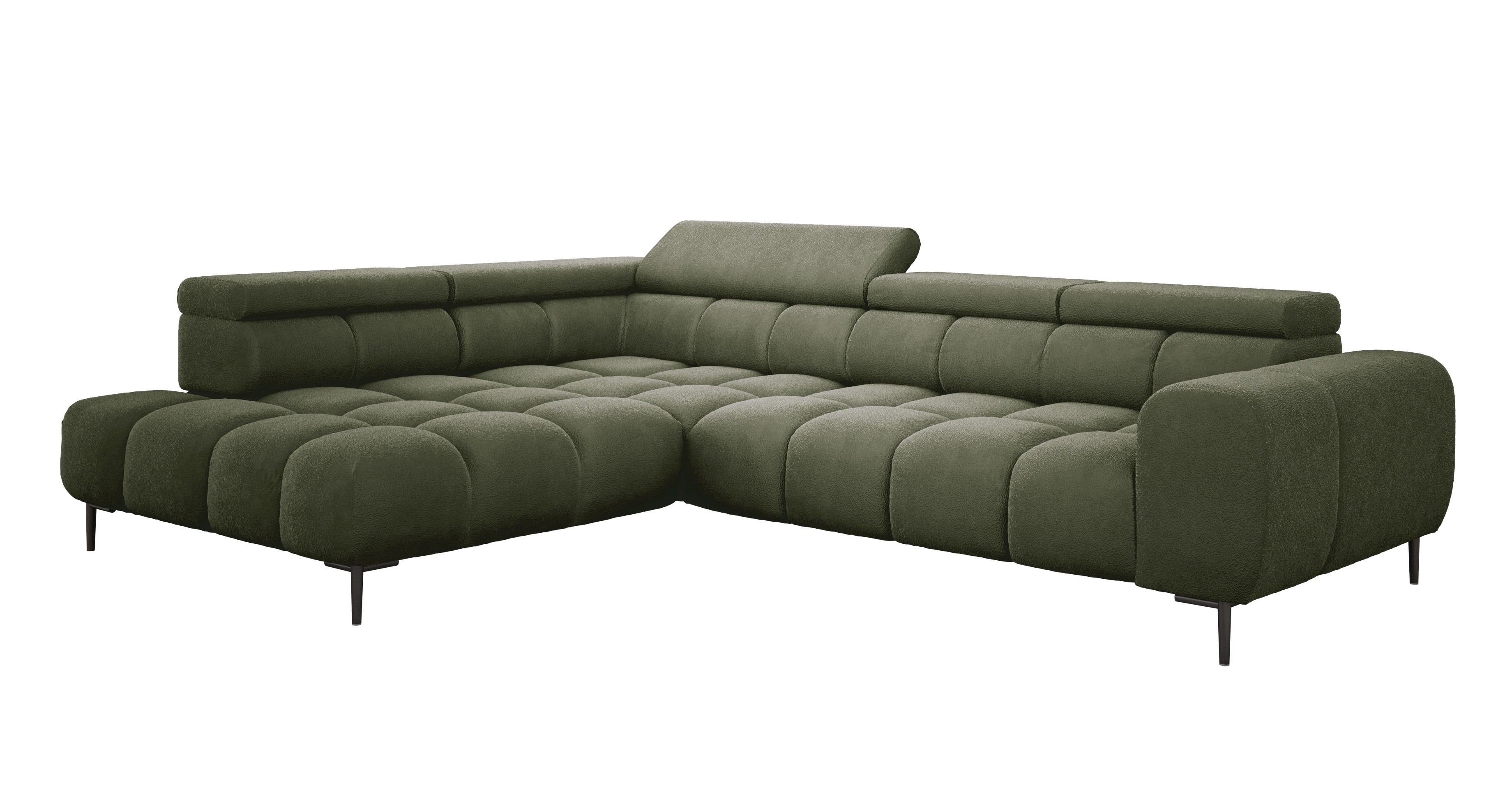 Stylowe pikowane siedzisko i wysokie metalowe nóżki (dostępne w kolorze czarnym lub złotym) nadają narożnikowi lekko loftowy, a jednocześnie nowoczesny charakter.