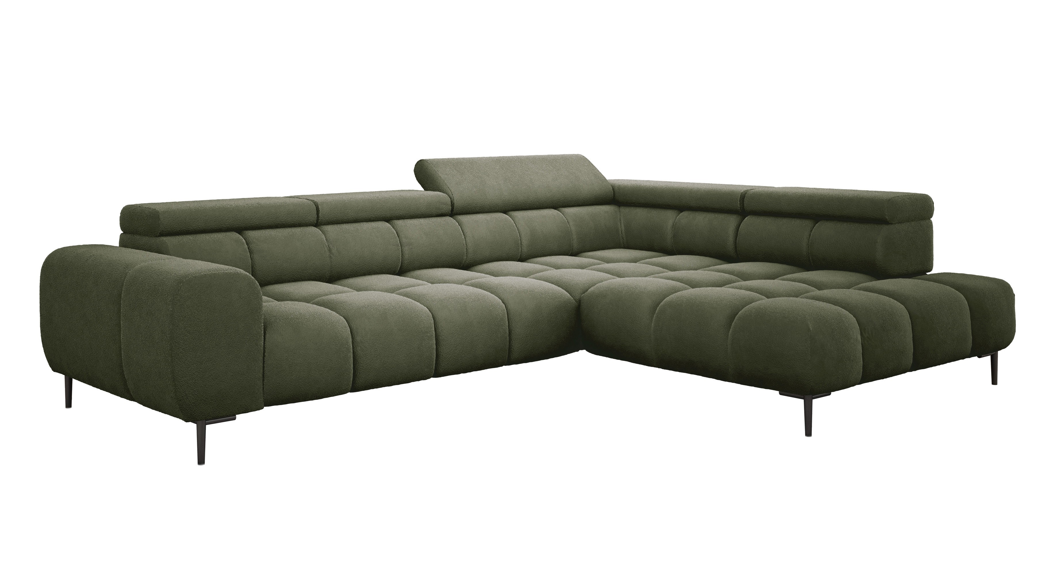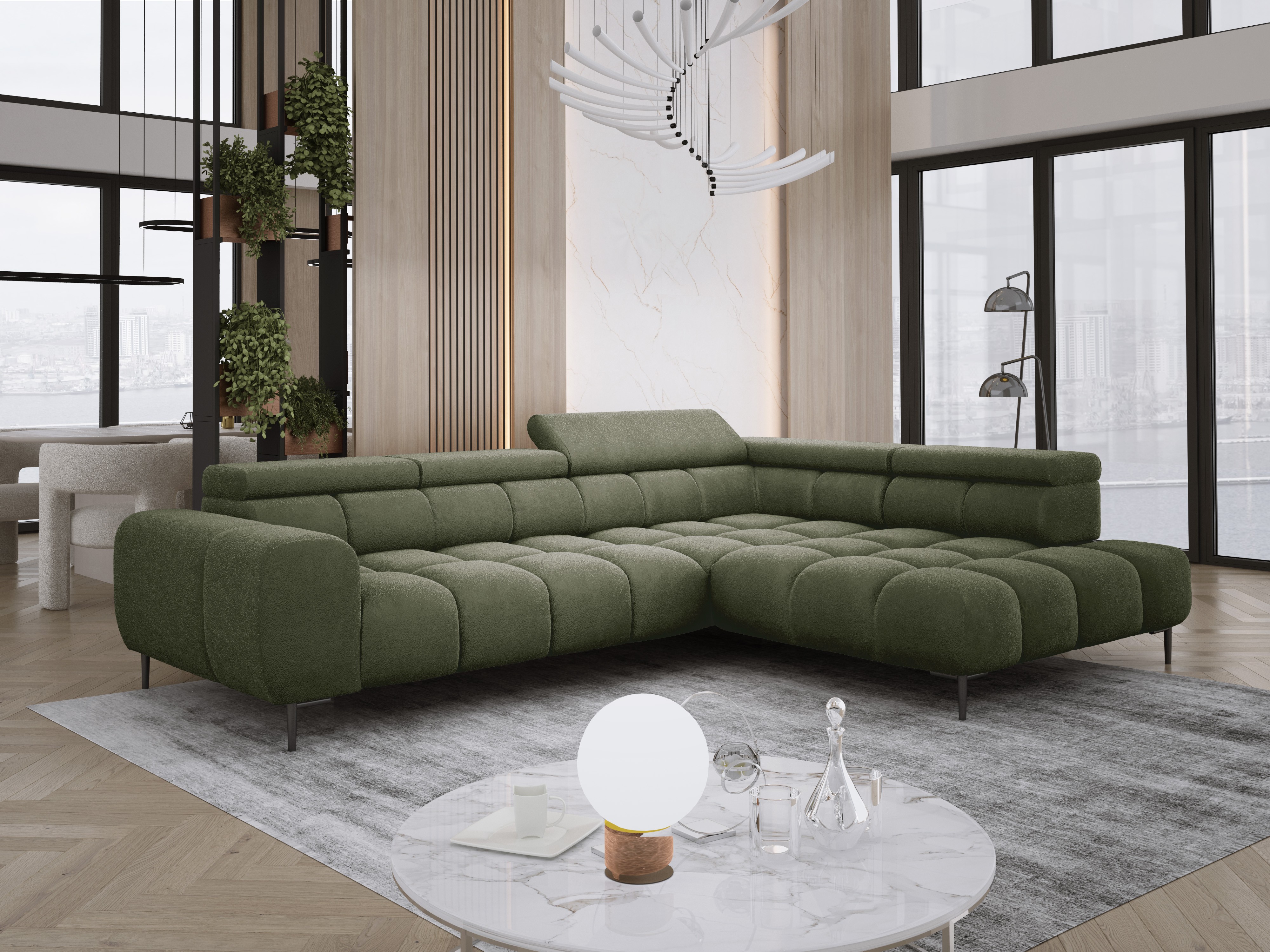 Stylowe pikowane siedzisko i wysokie metalowe nóżki (dostępne w kolorze czarnym lub złotym) nadają narożnikowi lekko loftowy, a jednocześnie nowoczesny charakter.