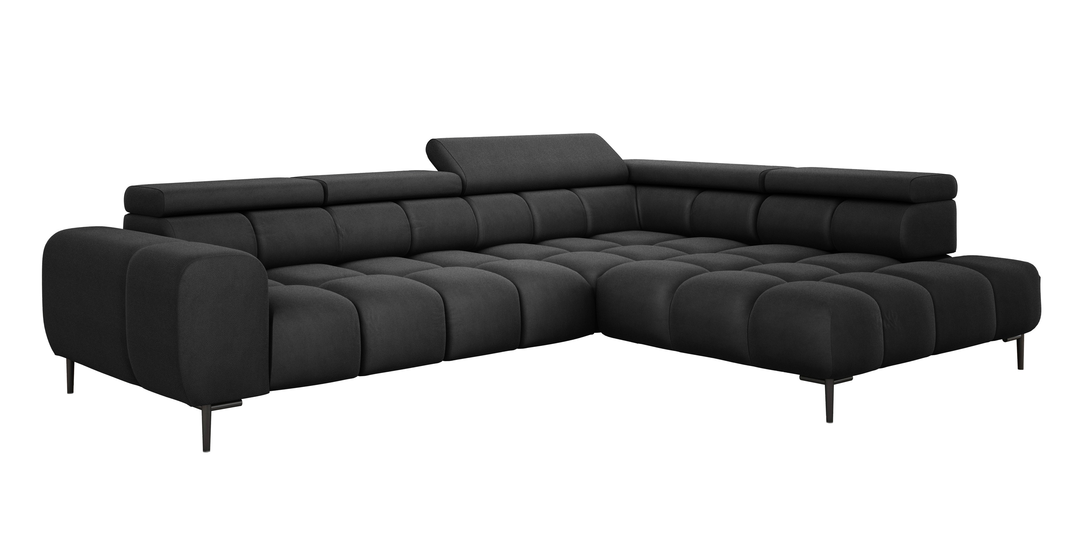 Stylowe pikowane siedzisko i wysokie metalowe nóżki (dostępne w kolorze czarnym lub złotym) nadają narożnikowi lekko loftowy, a jednocześnie nowoczesny charakter.