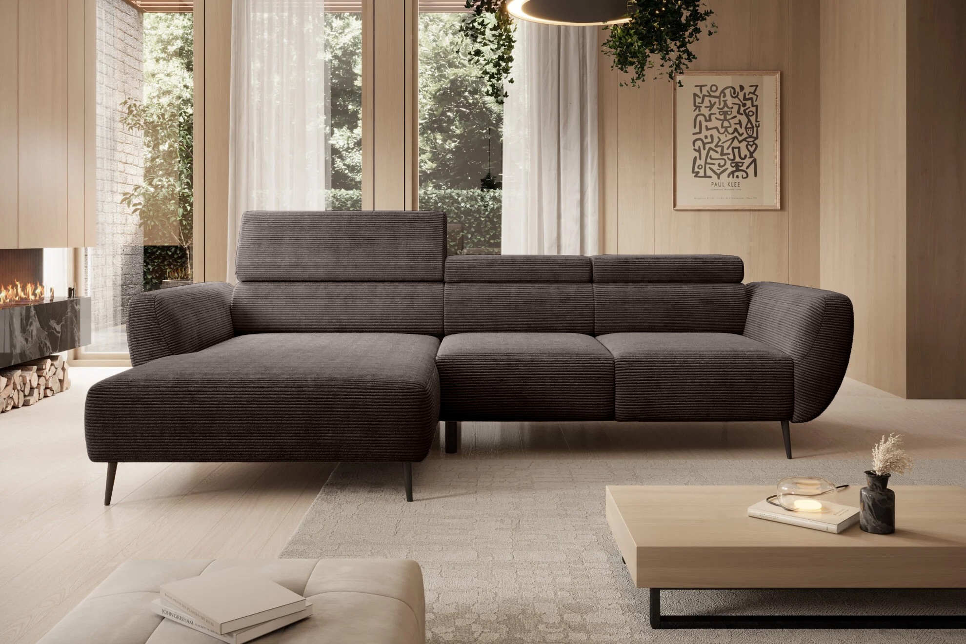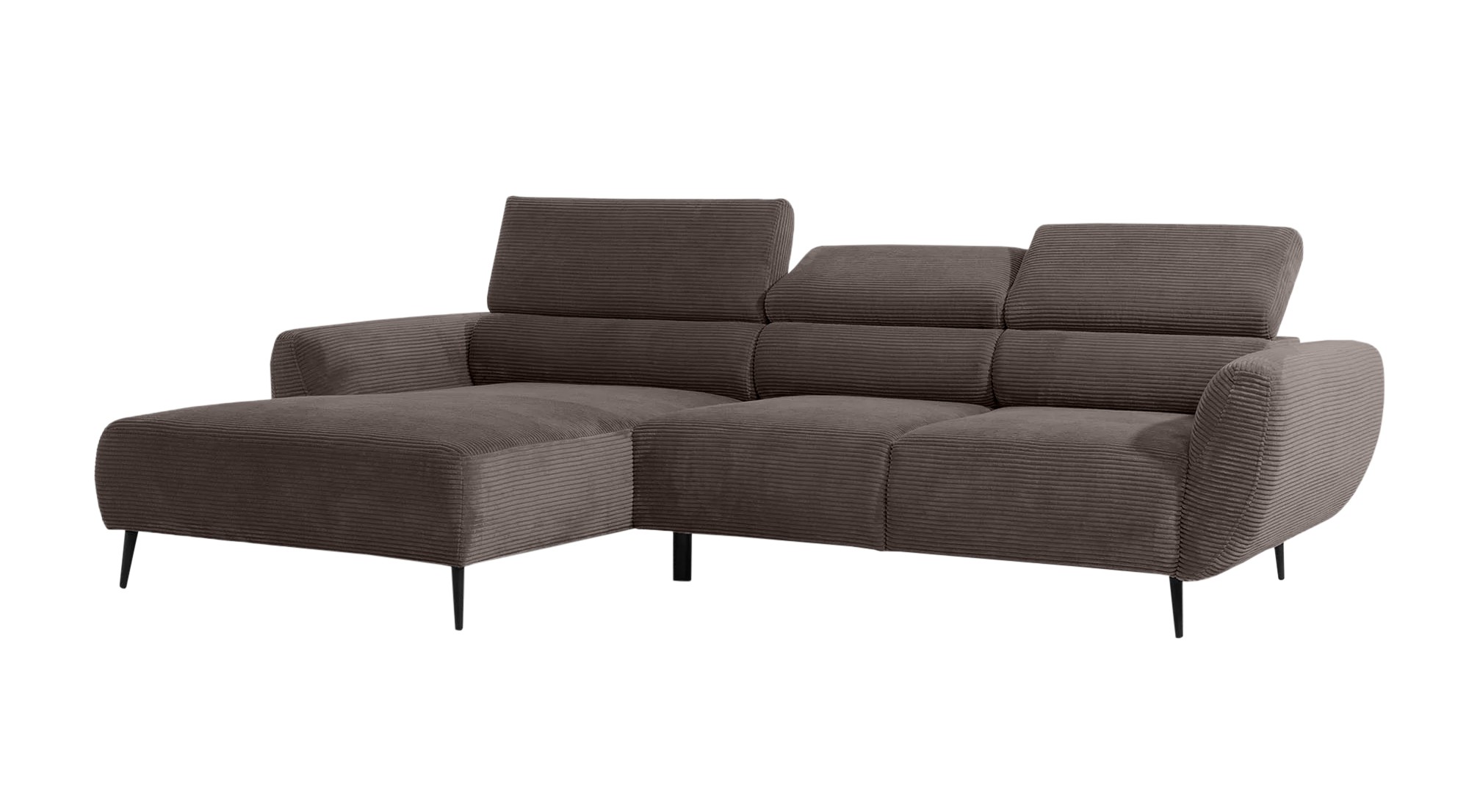 Gładkie siedzisko nadaje narożnikowi nowoczesnego charakteru, a wysokie metalowe nóżki w stylu loftowym dodają mu lekkości i elegancji.
