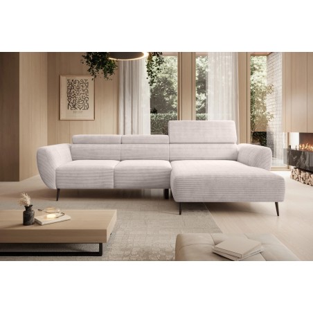 Gładkie siedzisko nadaje narożnikowi nowoczesnego charakteru, a wysokie metalowe nóżki w stylu loftowym dodają mu lekkości i elegancji.