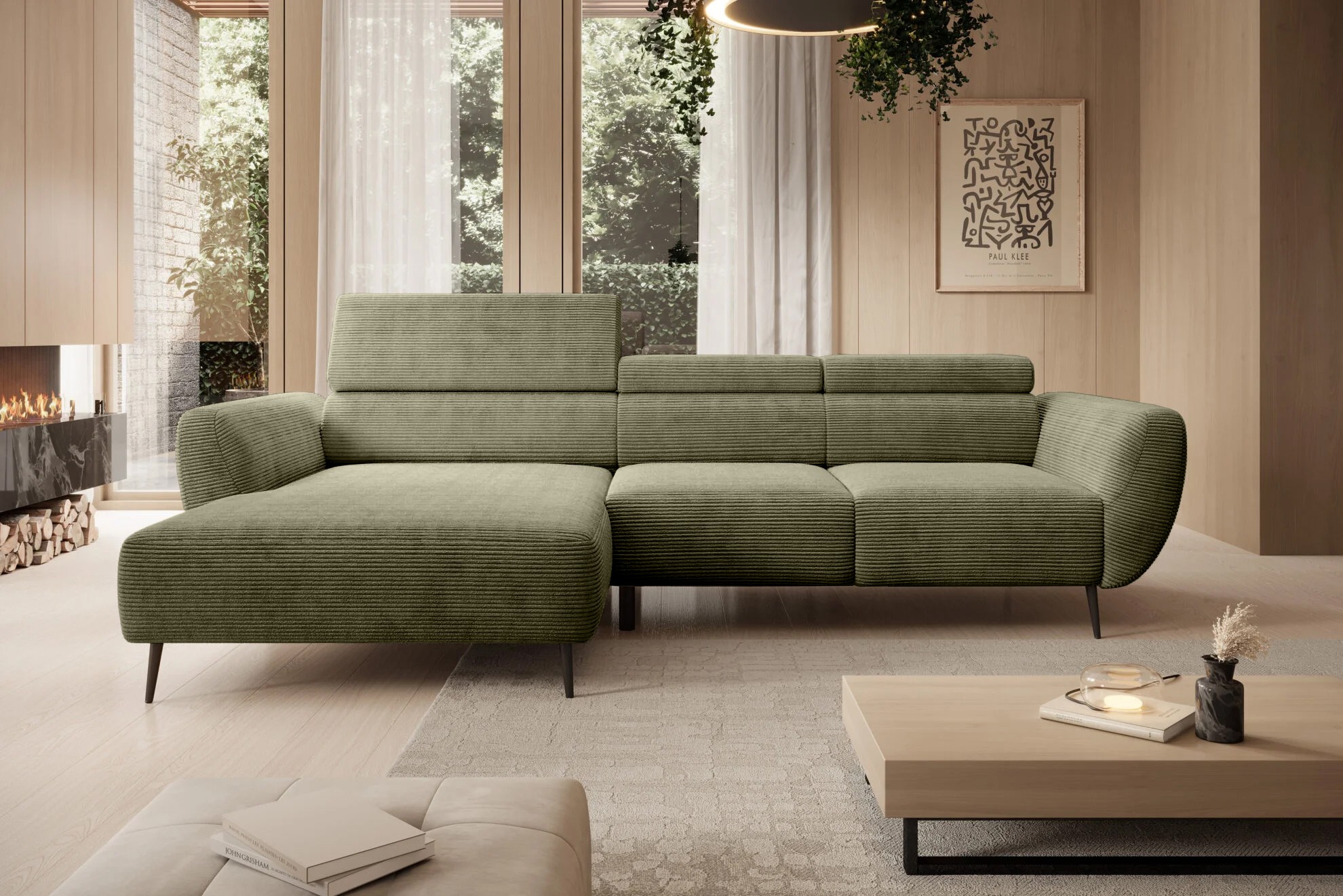 Gładkie siedzisko nadaje narożnikowi nowoczesnego charakteru, a wysokie metalowe nóżki w stylu loftowym dodają mu lekkości i elegancji.