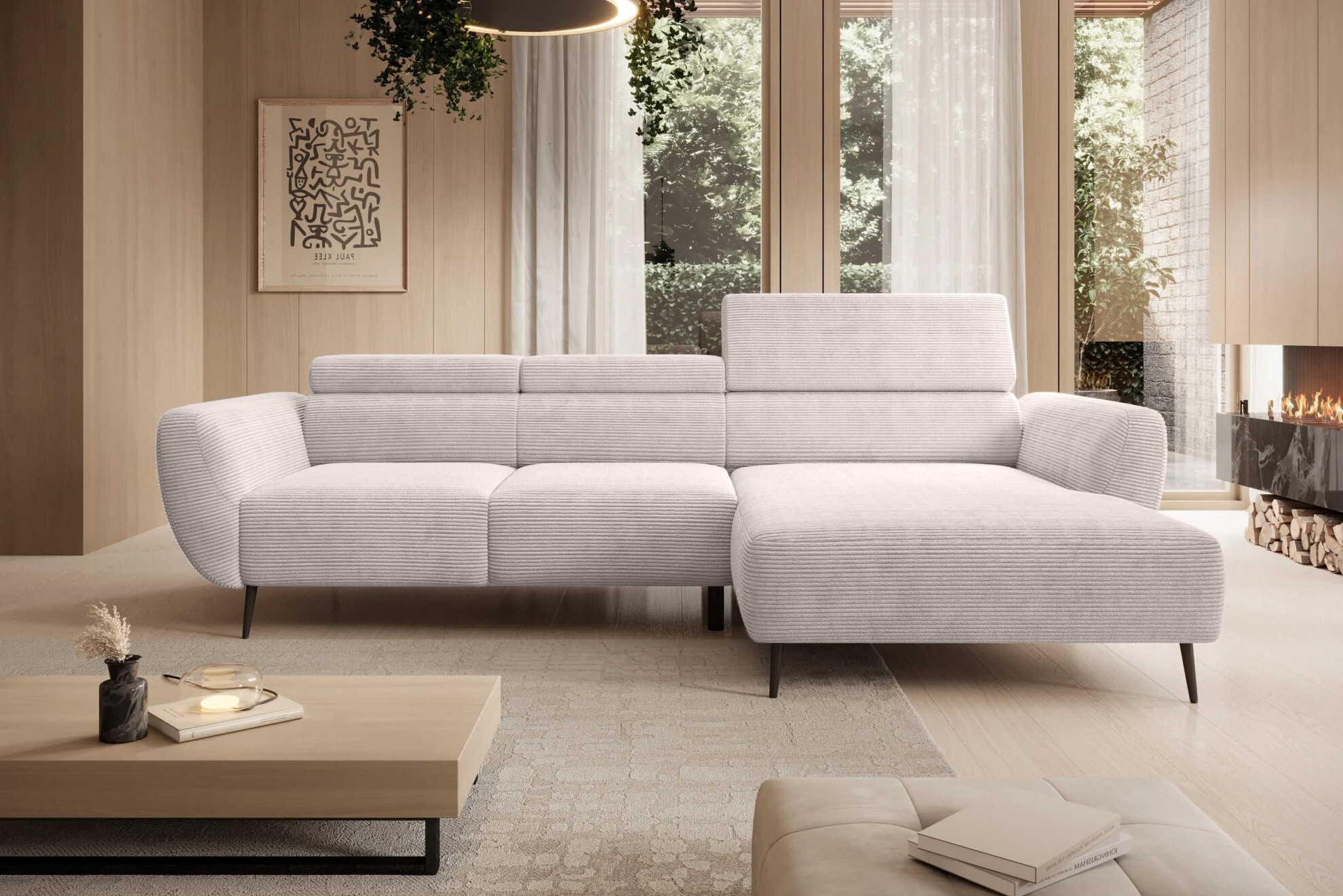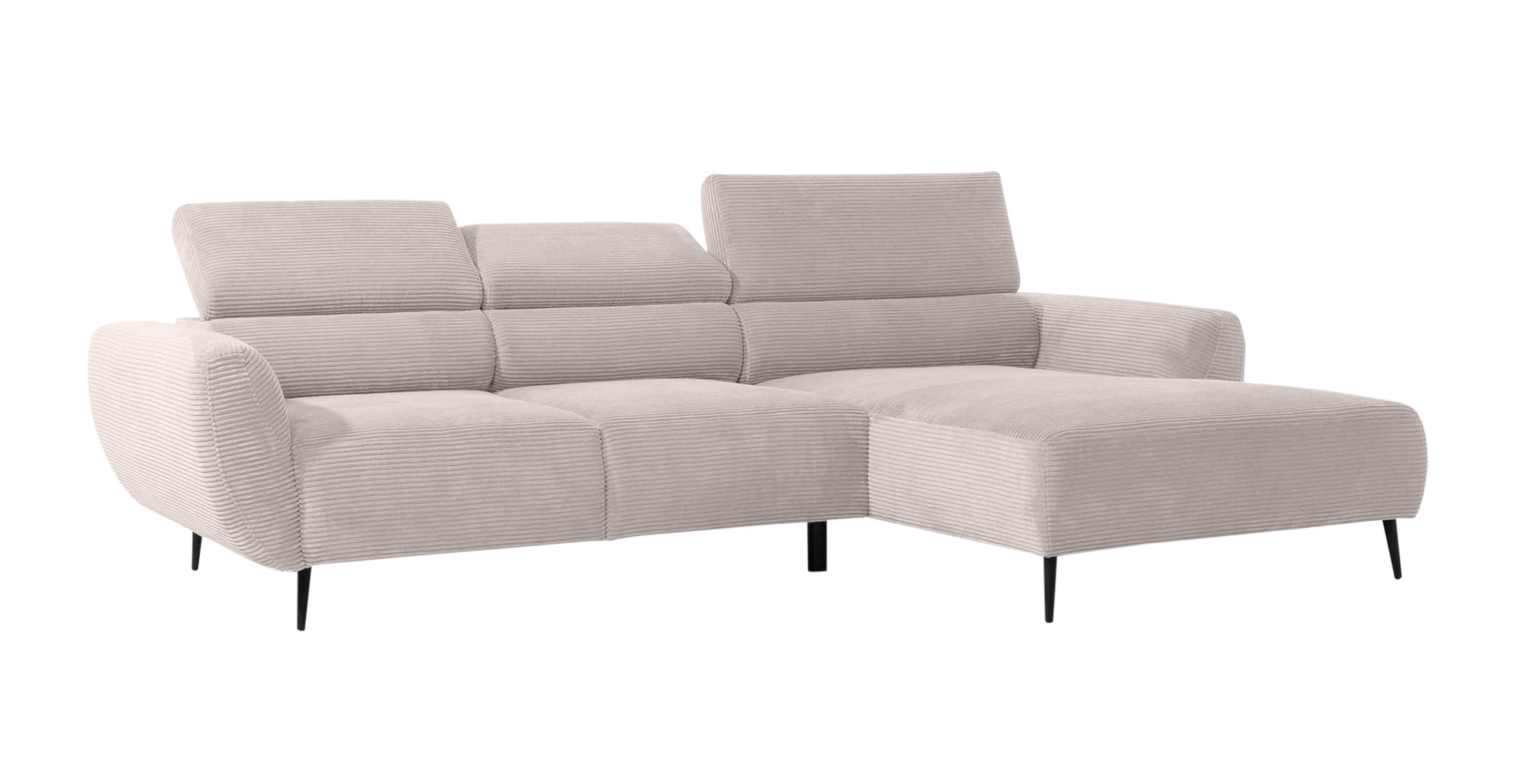 Gładkie siedzisko nadaje narożnikowi nowoczesnego charakteru, a wysokie metalowe nóżki w stylu loftowym dodają mu lekkości i elegancji.