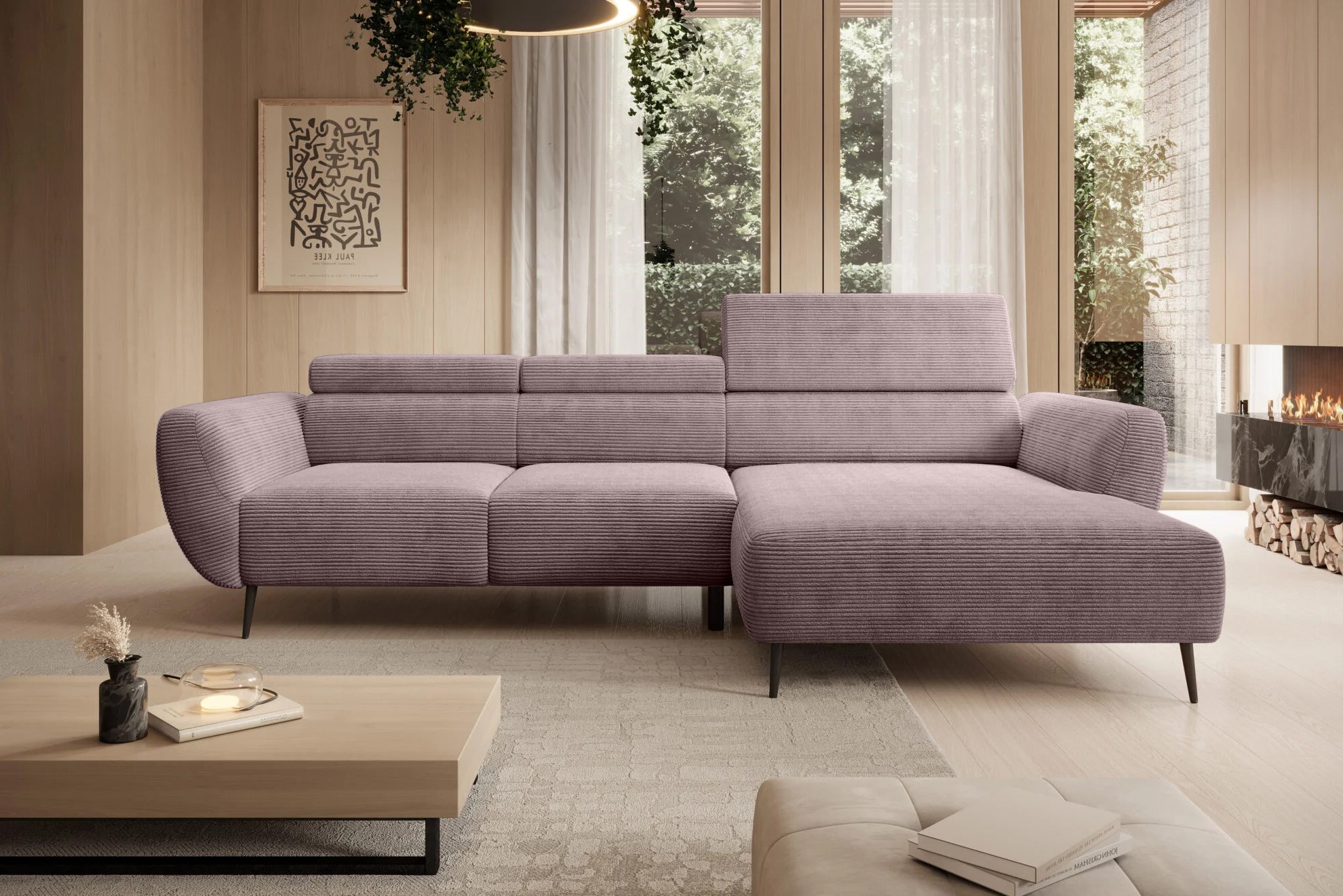 Gładkie siedzisko nadaje narożnikowi nowoczesnego charakteru, a wysokie metalowe nóżki w stylu loftowym dodają mu lekkości i elegancji.