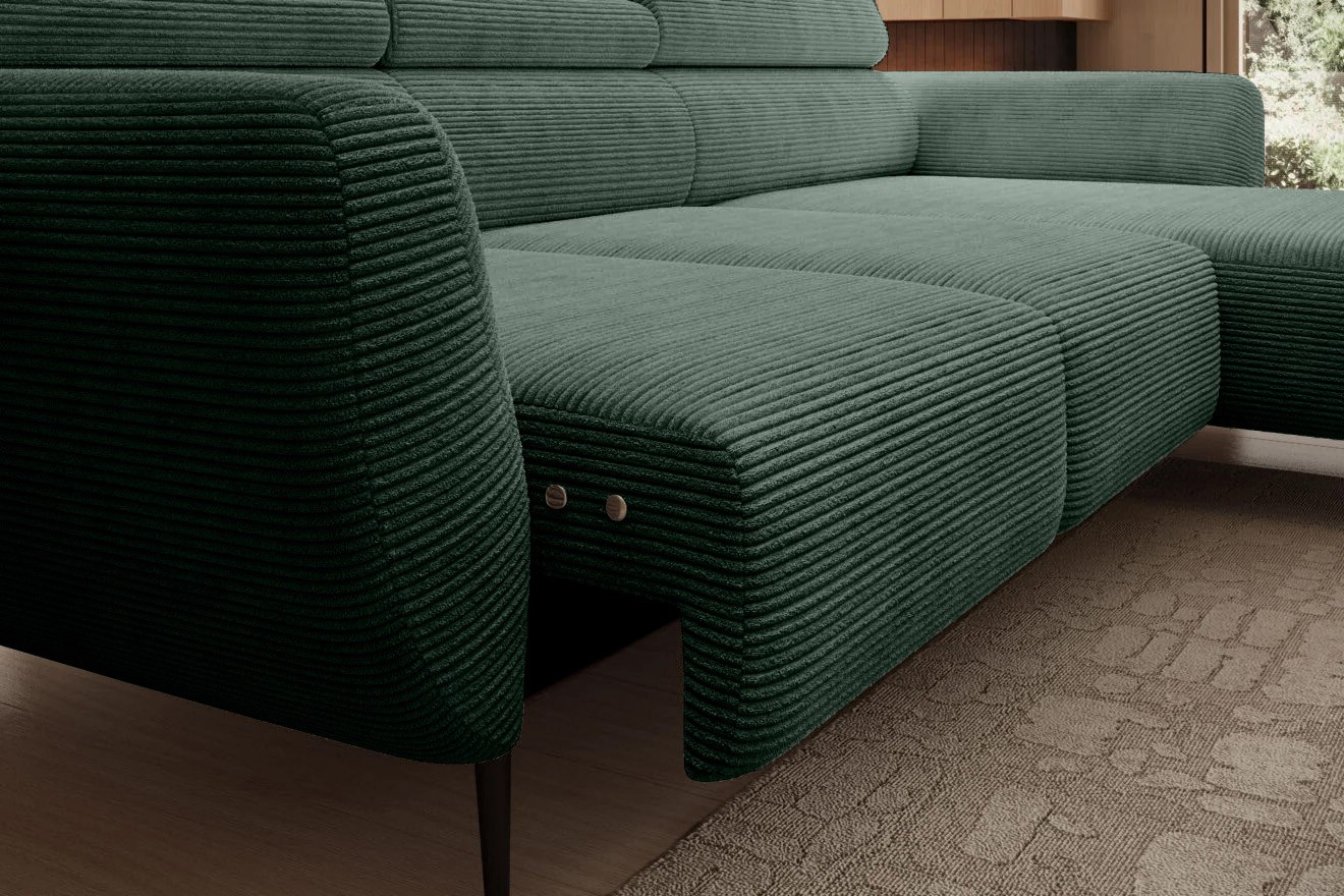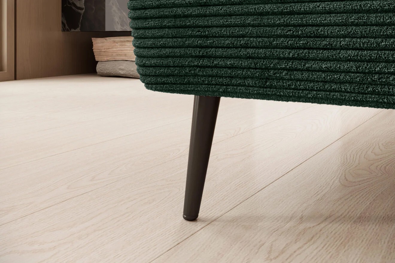 Gładkie siedzisko nadaje narożnikowi nowoczesnego charakteru, a wysokie metalowe nóżki w stylu loftowym dodają mu lekkości i elegancji.