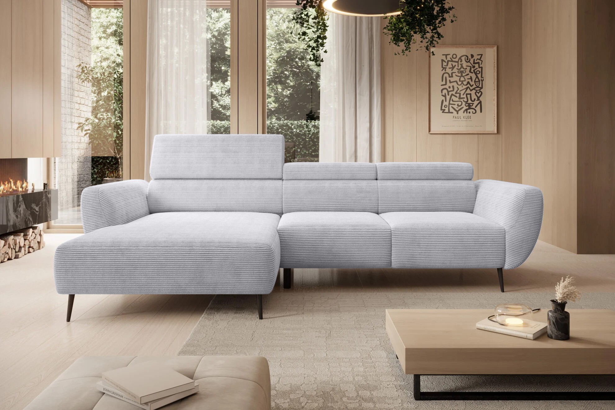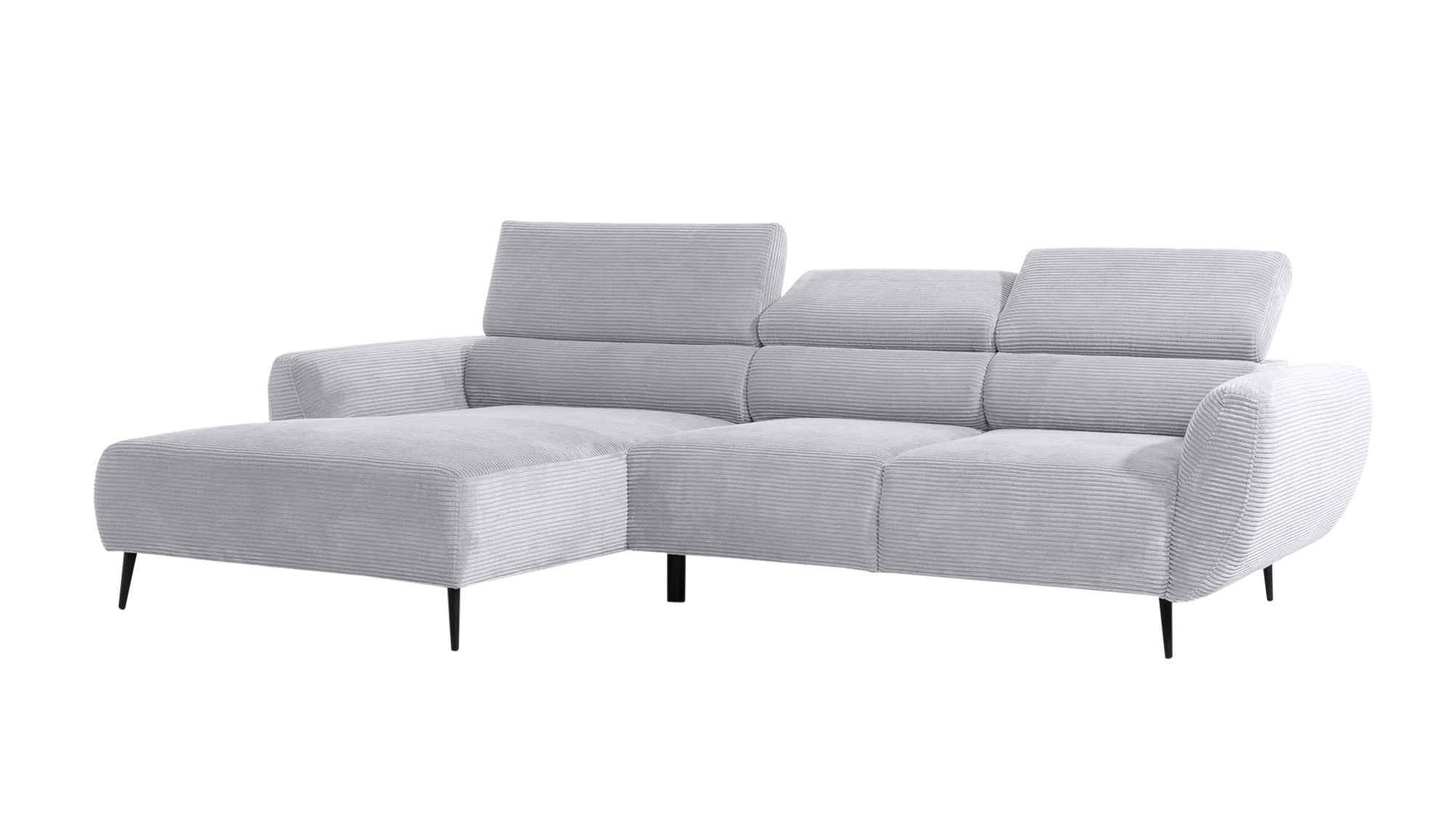 Gładkie siedzisko nadaje narożnikowi nowoczesnego charakteru, a wysokie metalowe nóżki w stylu loftowym dodają mu lekkości i elegancji.