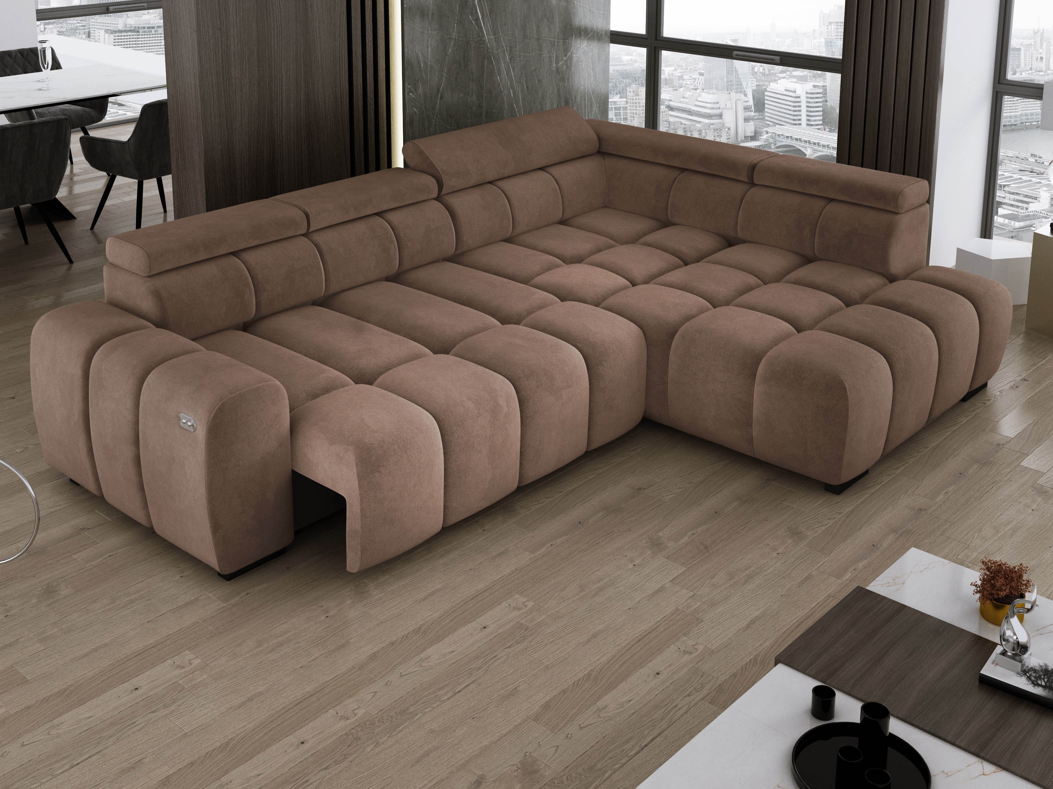 Wyposażony w elektrycznie wysuwane siedzisko (do 27 cm), OMBO oferuje wygodną przestrzeń do wypoczynku oraz praktyczną funkcję spania na co dzień.