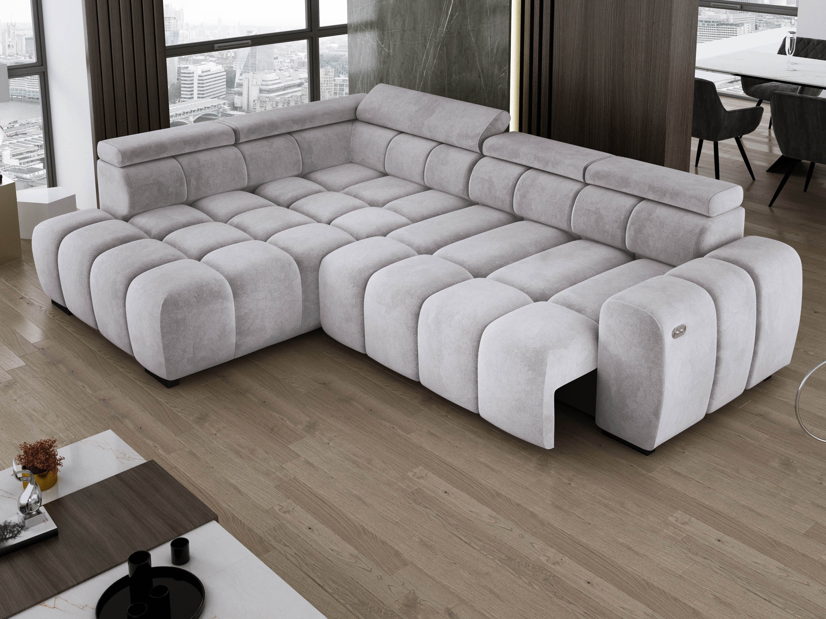 Wyposażony w elektrycznie wysuwane siedzisko (do 27 cm), OMBO oferuje wygodną przestrzeń do wypoczynku oraz praktyczną funkcję spania na co dzień.