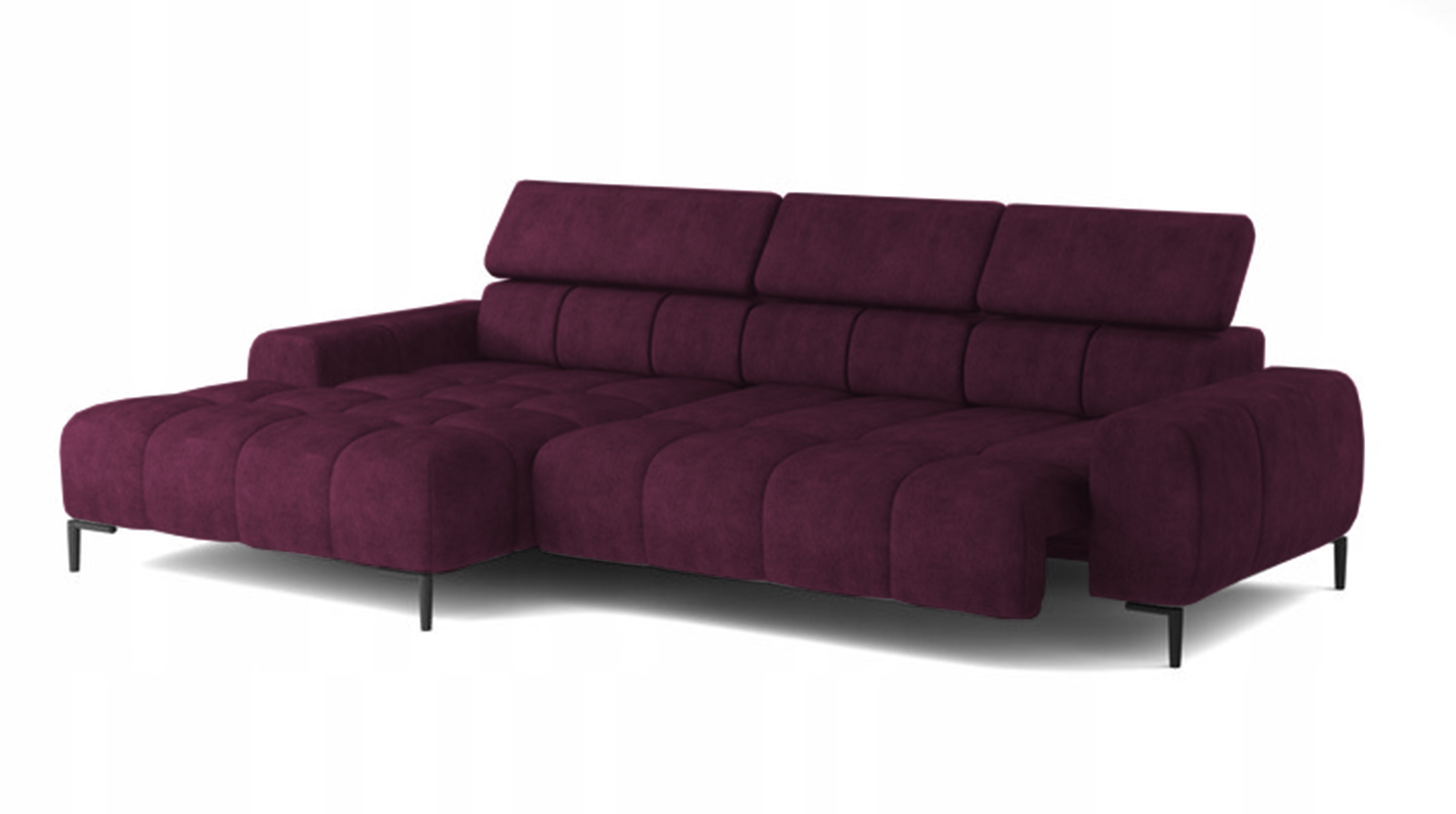 Pikowane siedzisko nadaje narożnikowi nowoczesnego charakteru, a wysokie metalowe nóżki (czarne lub złote) w stylu loftowym dodają mu lekkości i elegancji.