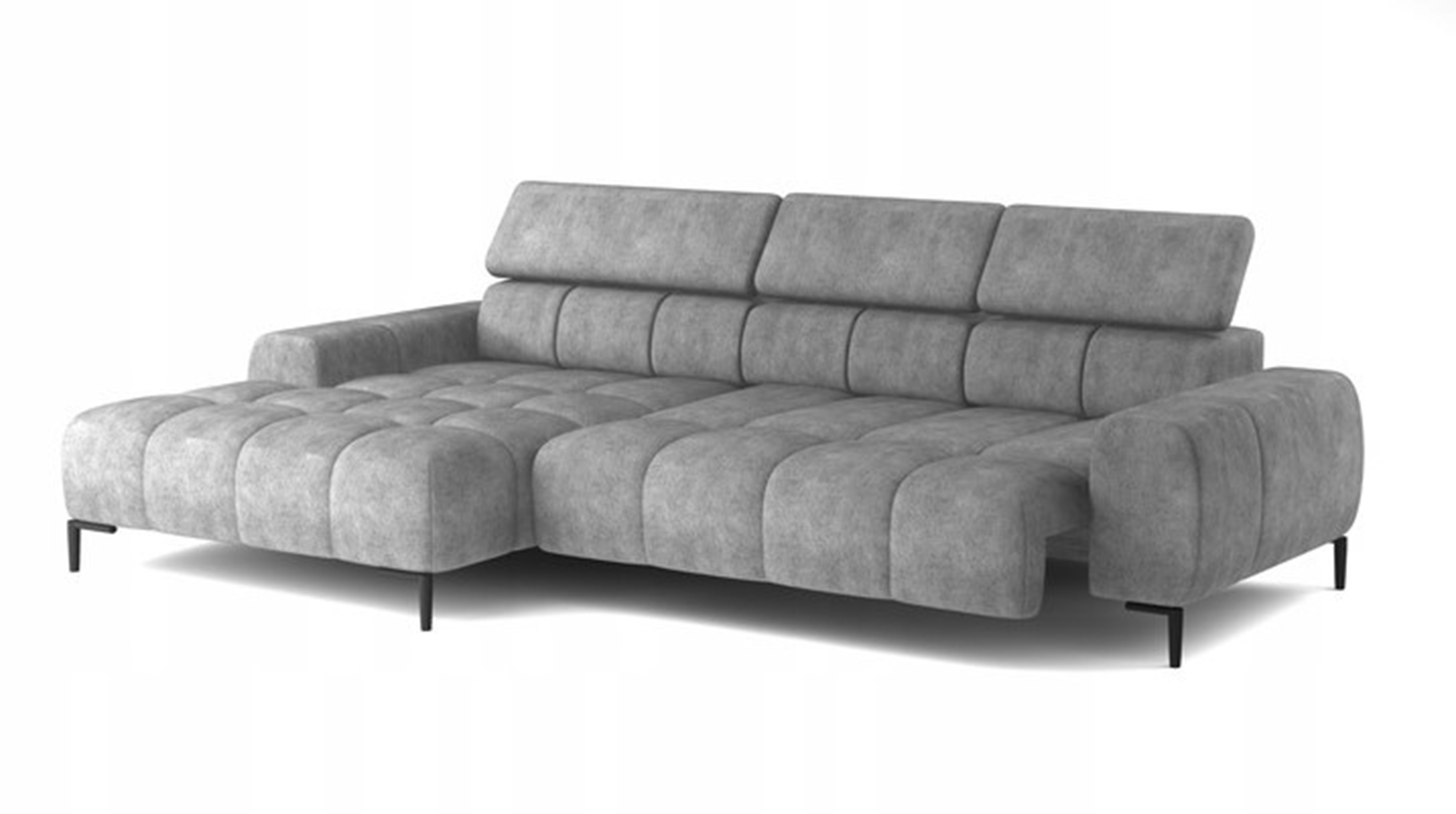 Pikowane siedzisko nadaje narożnikowi nowoczesnego charakteru, a wysokie metalowe nóżki (czarne lub złote) w stylu loftowym dodają mu lekkości i elegancji.