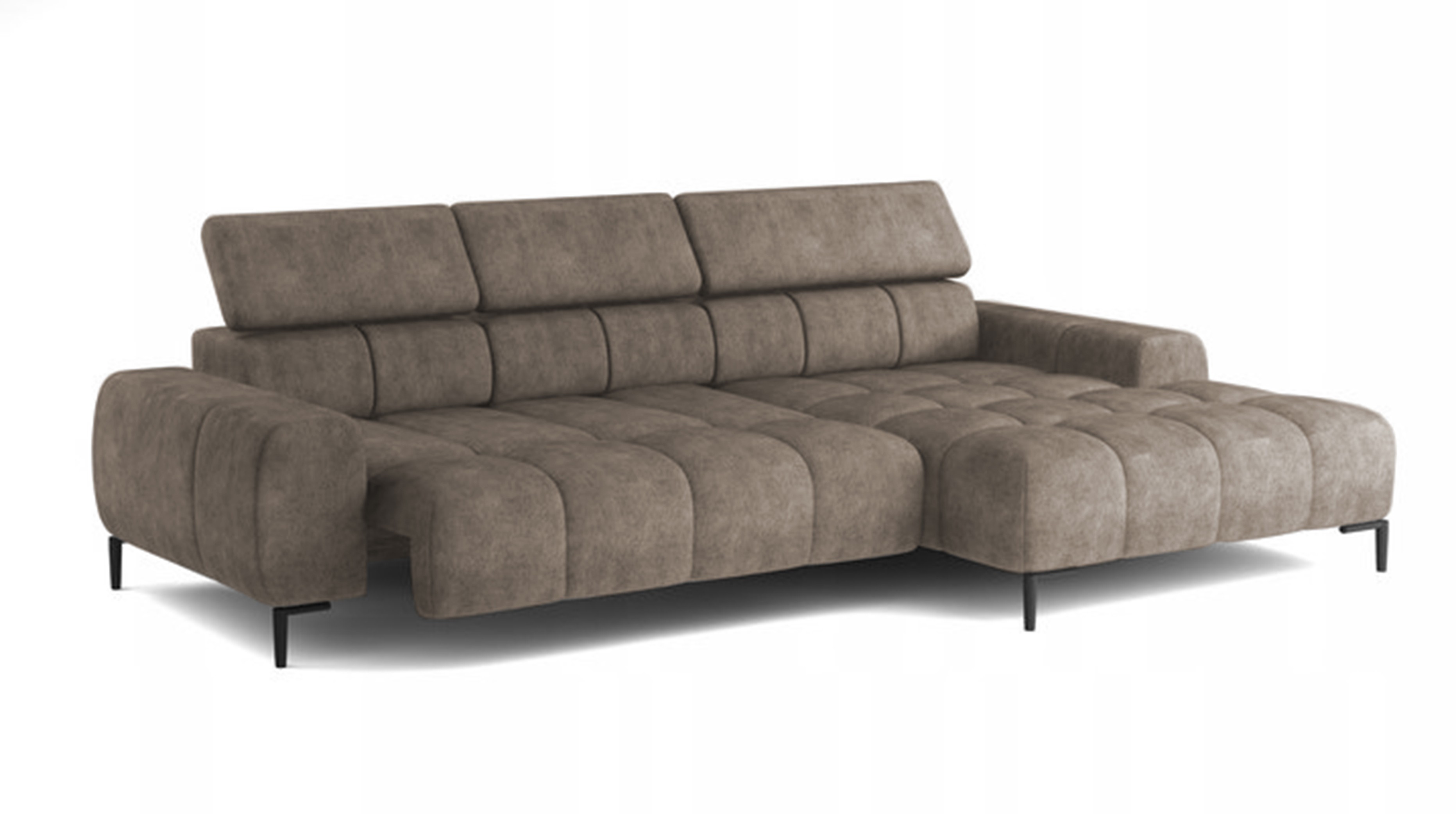 Pikowane siedzisko nadaje narożnikowi nowoczesnego charakteru, a wysokie metalowe nóżki (czarne lub złote) w stylu loftowym dodają mu lekkości i elegancji.