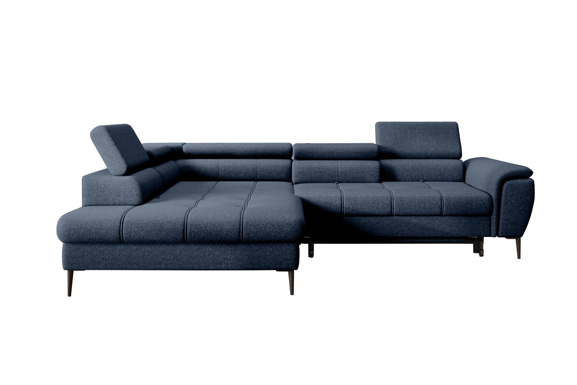 Stylowe pikowane siedzisko i wysokie metalowe nóżki (dostępne w kolorze czarnym lub złotym) nadają narożnikowi lekko loftowy, a jednocześnie nowoczesny charakter.