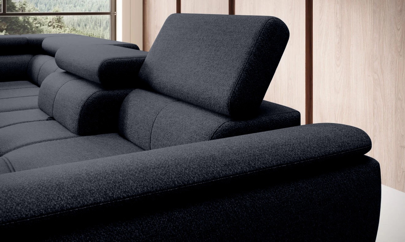 Dodatkowo narożnik wyposażony jest w przesuwne oparcie oraz regulowane zagłówki, które można zablokować w wybranej pozycji, zapewniając jeszcze większy komfort.