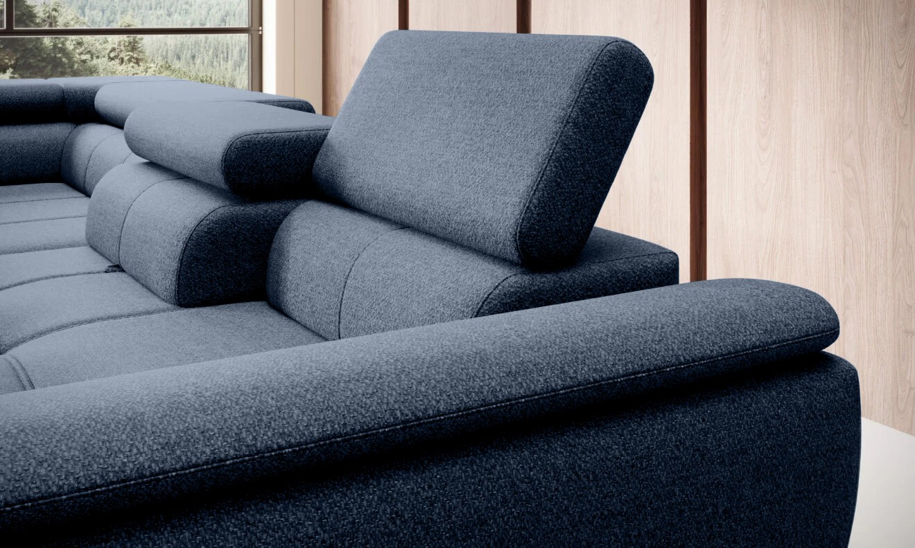 Dodatkowo narożnik wyposażony jest w przesuwne oparcie oraz regulowane zagłówki, które można zablokować w wybranej pozycji, zapewniając jeszcze większy komfort.