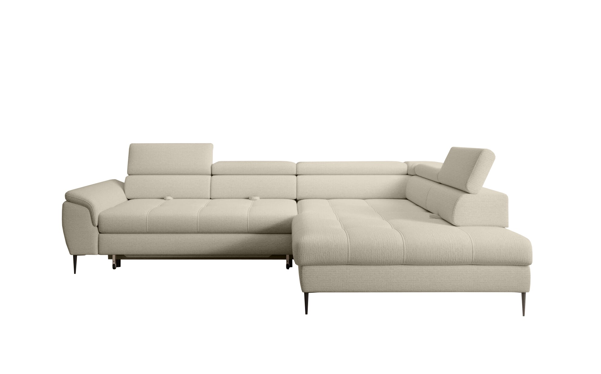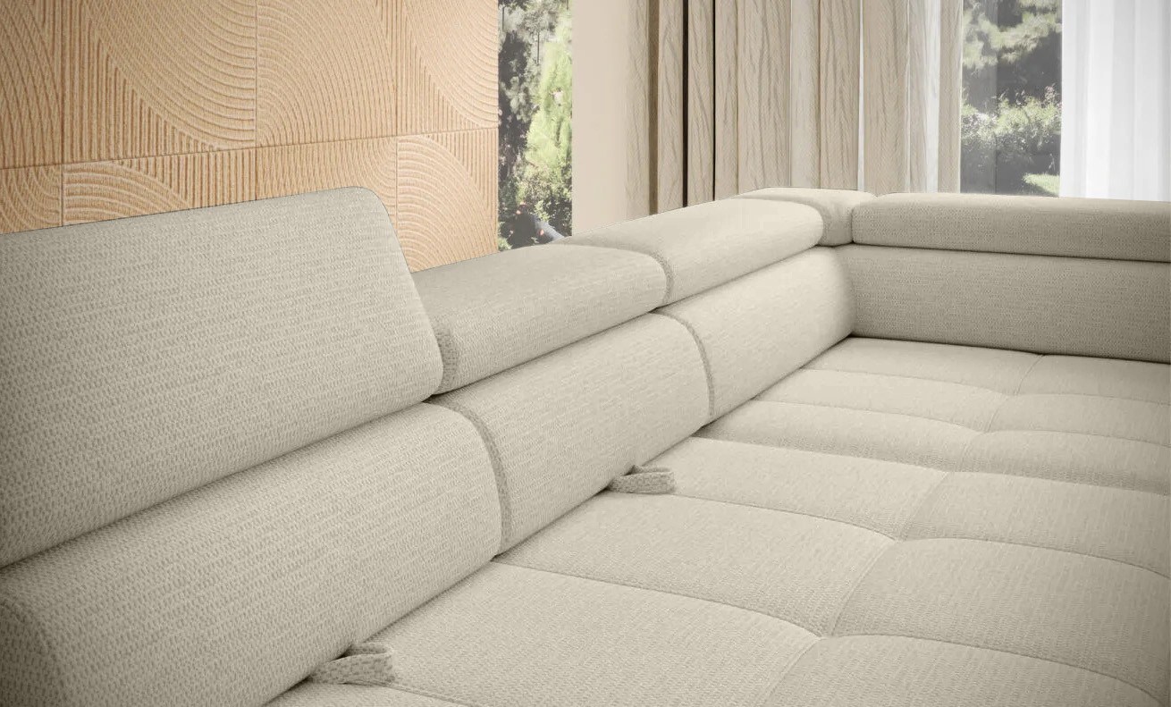 Dodatkowo narożnik wyposażony jest w przesuwne oparcie oraz regulowane zagłówki, które można zablokować w wybranej pozycji, zapewniając jeszcze większy komfort.