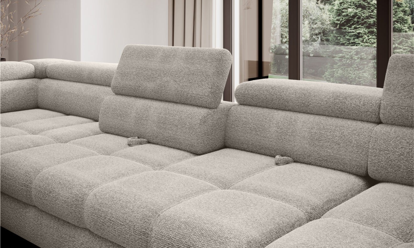 Dodatkowo narożnik wyposażony jest w przesuwne oparcie oraz regulowane zagłówki, które można zablokować w wybranej pozycji, zapewniając jeszcze większy komfort.