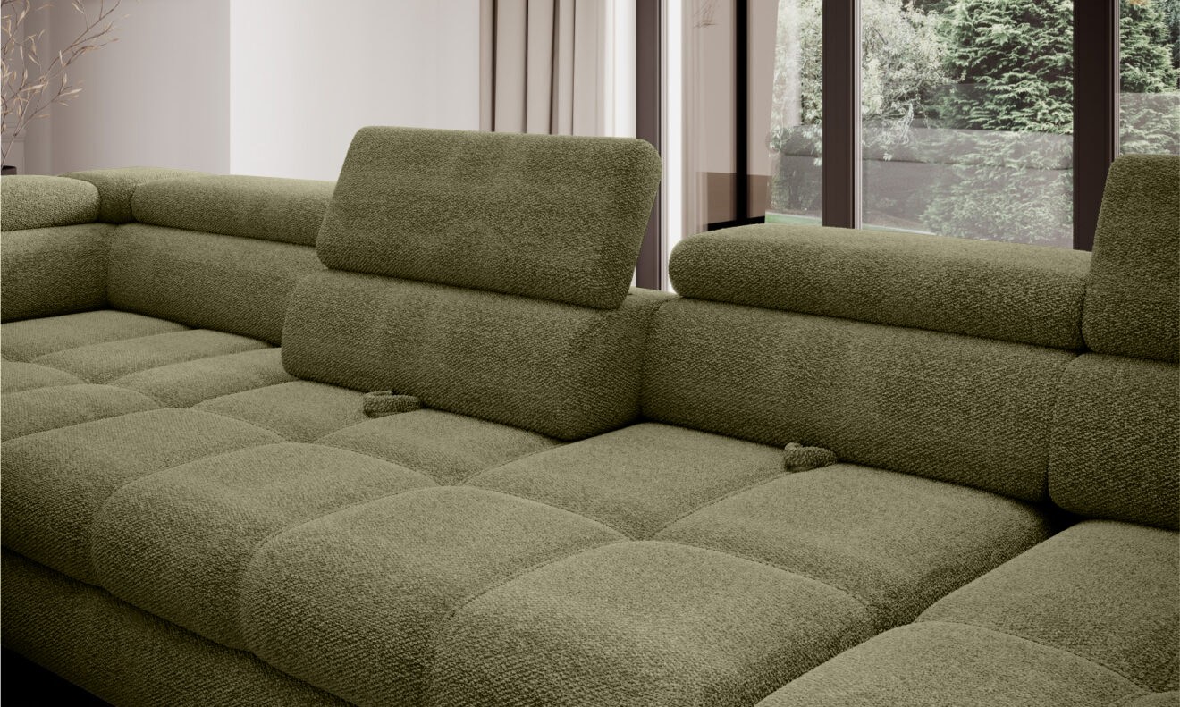 Dodatkowo narożnik wyposażony jest w przesuwne oparcie oraz regulowane zagłówki, które można zablokować w wybranej pozycji, zapewniając jeszcze większy komfort.