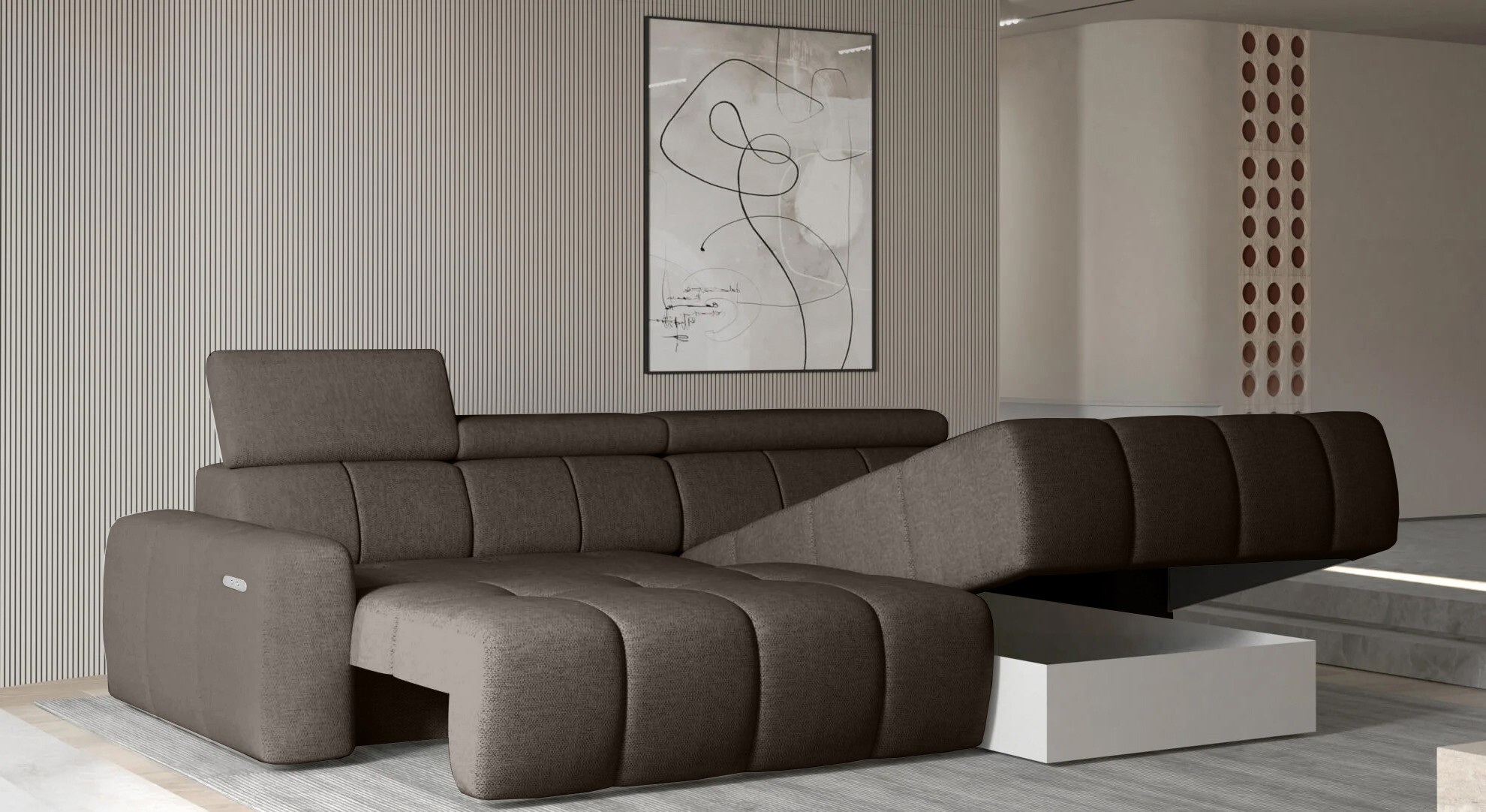 Wyposażony w elektrycznie rozkładaną funkcję spania, narożnik ENZO S umożliwia wygodny odpoczynek zarówno w ciągu dnia, jak i w nocy.