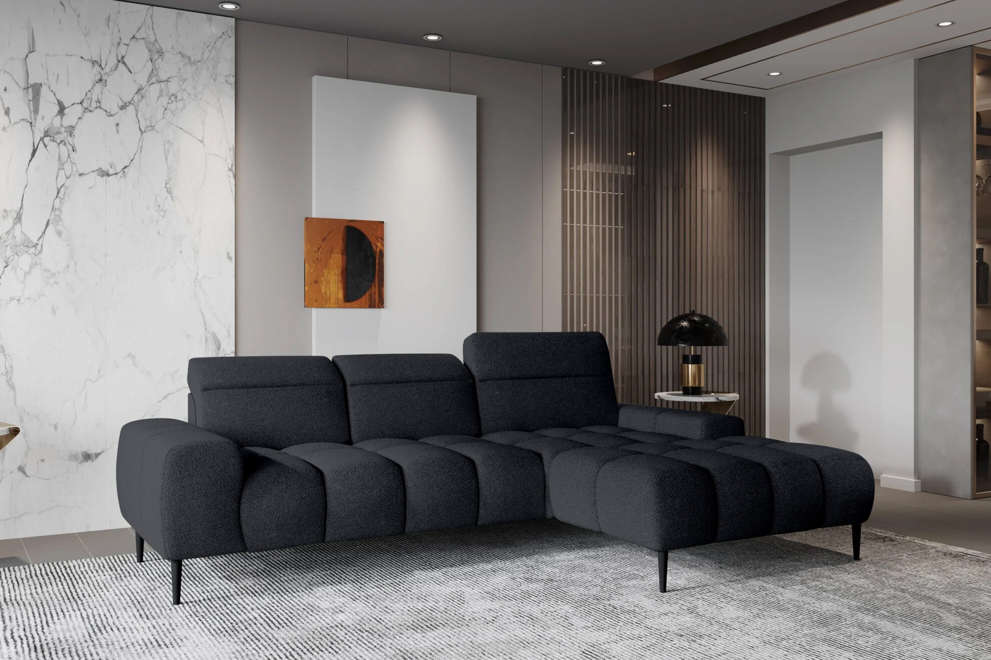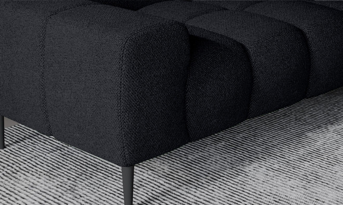 Pikowane siedzisko nadaje narożnikowi nowoczesnego charakteru, a wysokie metalowe nóżki w stylu loftowym dodają mu lekkości i elegancji.
