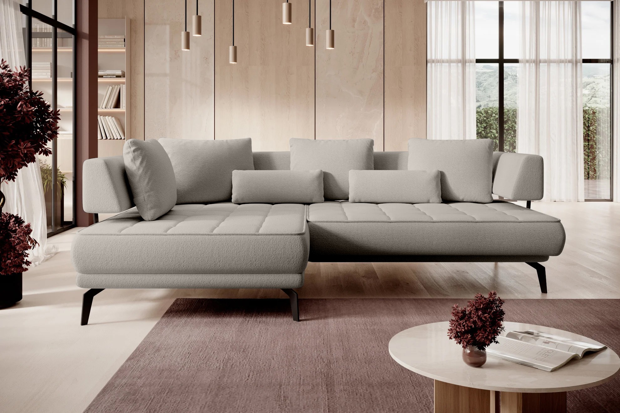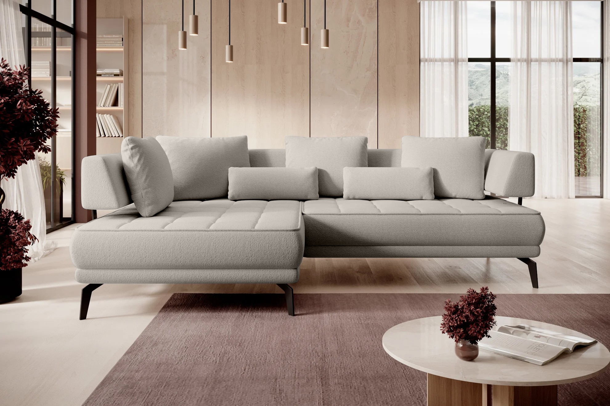 Stylowe pikowane siedzisko i wysokie metalowe nóżki nadają narożnikowi lekko loftowy, a jednocześnie nowoczesny charakter.